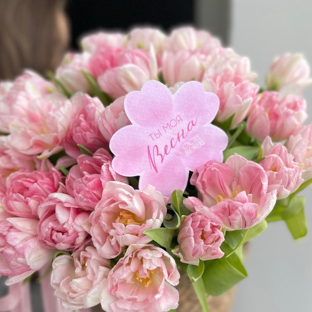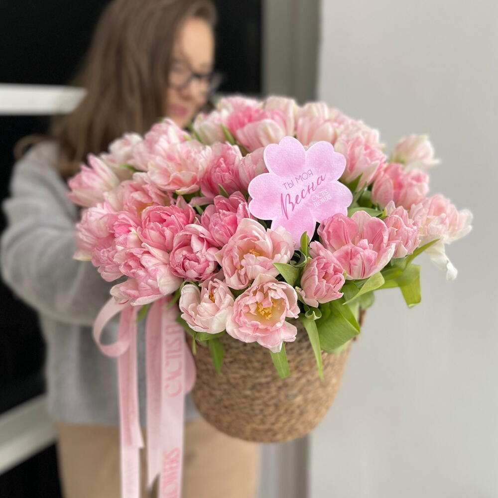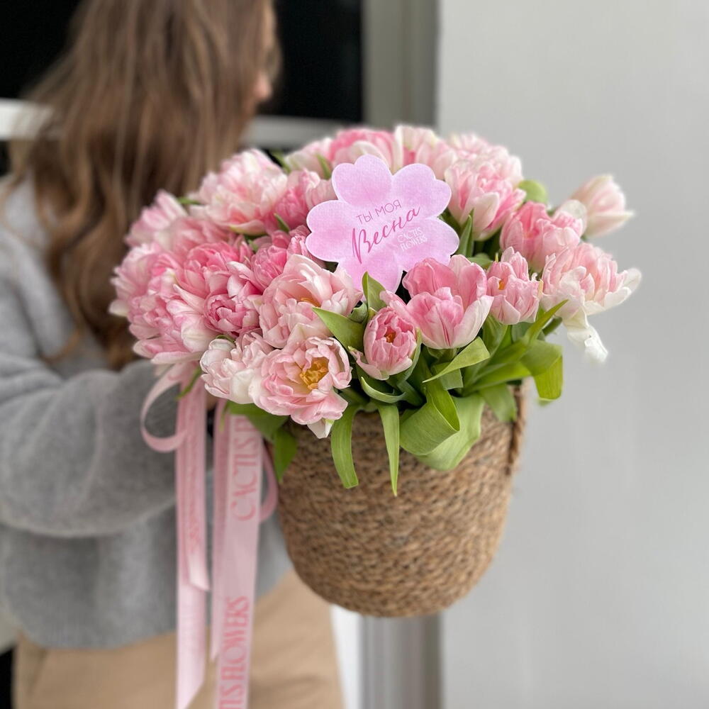 «Сен менің Көктемім» 29 пион тәрізді тюльпан ротанг себетінде (түсі келісім бойынша өзгеруі мүмкін)