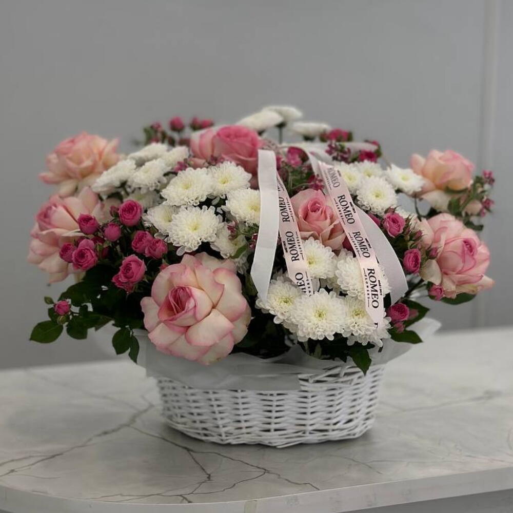 Этот изысканный состав Цветов в корзине станет превосходным шедевром на любом праздничном столе или украшением интерьера. Сочетание 7 стильных твидий, 7 изысканных спрей-роз, 5 пышных кустовых хризантем и 7 роскошных сортовых роз создает неповторимый колоритный флористический ансамбль. Гармония фактур и оттенков оставляет незабываемые впечатления. Подарите близким тепло и уют, выбрав эту красивую корзину с цветами.
