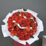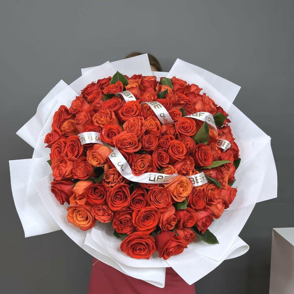 Нежный монобукет из ста одной алой розы, символизирующий искреннюю любовь и восхищение, дополненный семью ветками свежего эвкалипта. Этот букет станет идеальным подарком на любой памятный момент, он окунет вас в атмосферу романтики и незабываемых эмоций. Его аромат будет напоминать о счастливых моментах и радовать вас долгое время. Чтобы цветы дольше сохраняли свежесть, обновляйте срезы стеблей на 1–2 см, меняйте воду каждый день и держите букет в прохладном месте, подальше от прямых солнечных лучей и сквозняков. Добавление специального питания для срезанных цветов поможет сохранить их красоту ещё дольше.