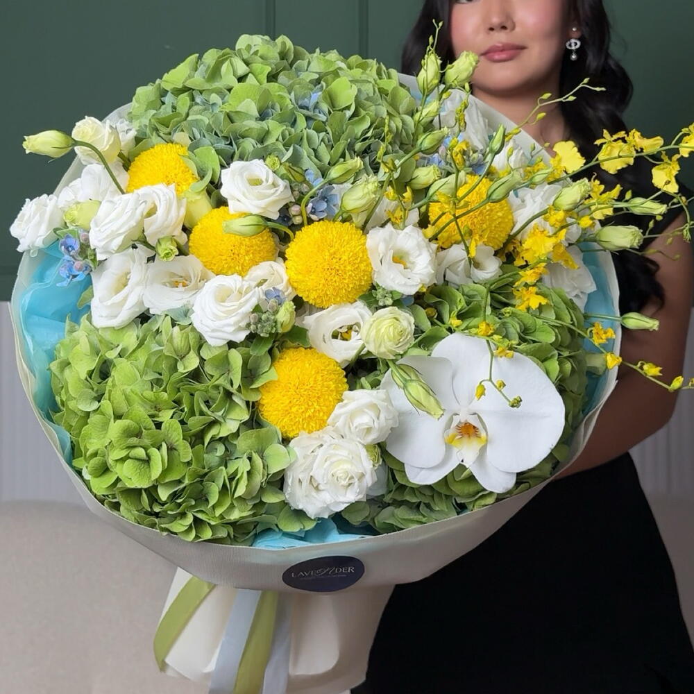 Гортензия - 3 дана Эустома - 15 дана Хризантема момоко - 5 дана Твидия - 5 дана онцидиум - 2 дана