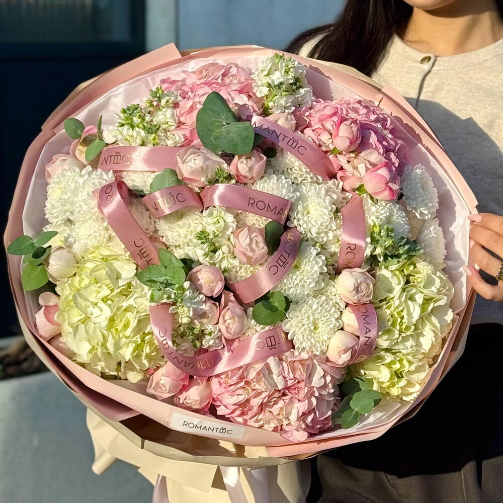 Гортензия - 5 дана Хризантема бұтасы - 5 дана Спрей роза - 5 дана эвкалипт ветка - 1 дана матиола - 5 дана