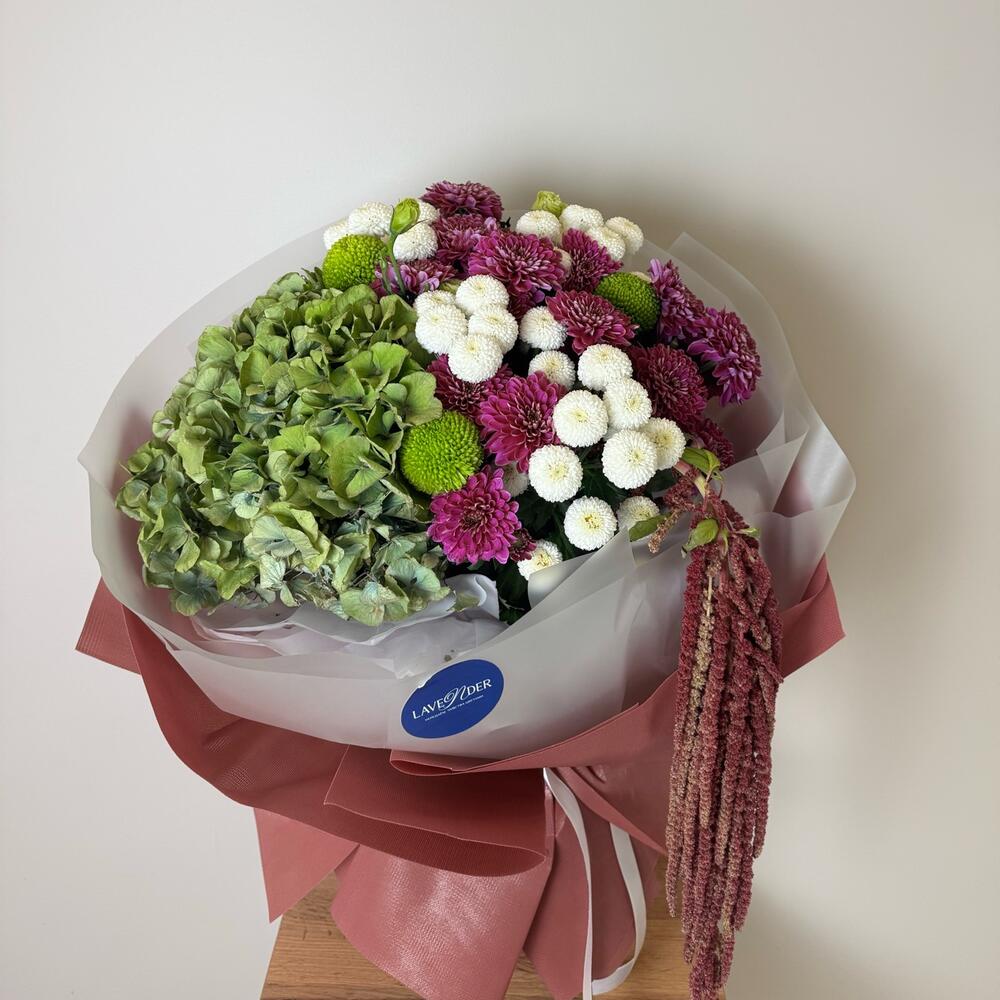 Гортензия - 1 дана Эустома - 3 дана Амарант - 1 дана момоко - 3 дана хризантемы кустовые - 9 дана