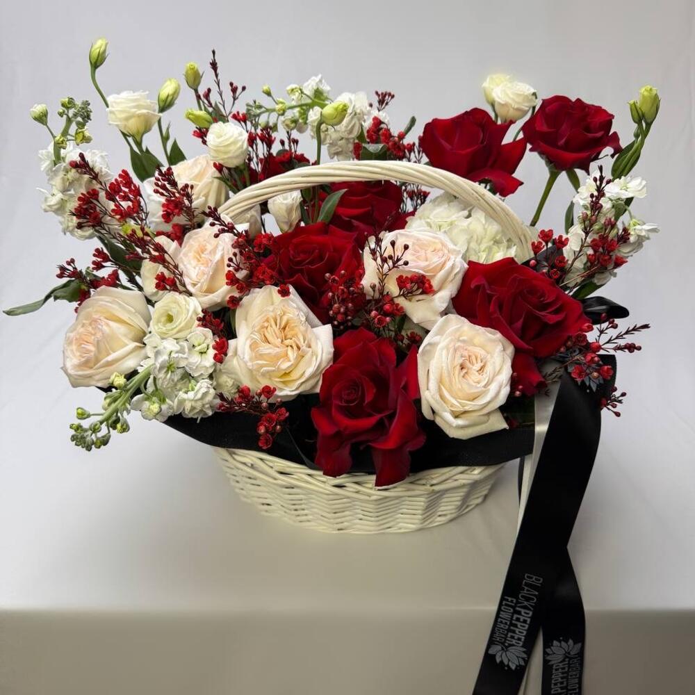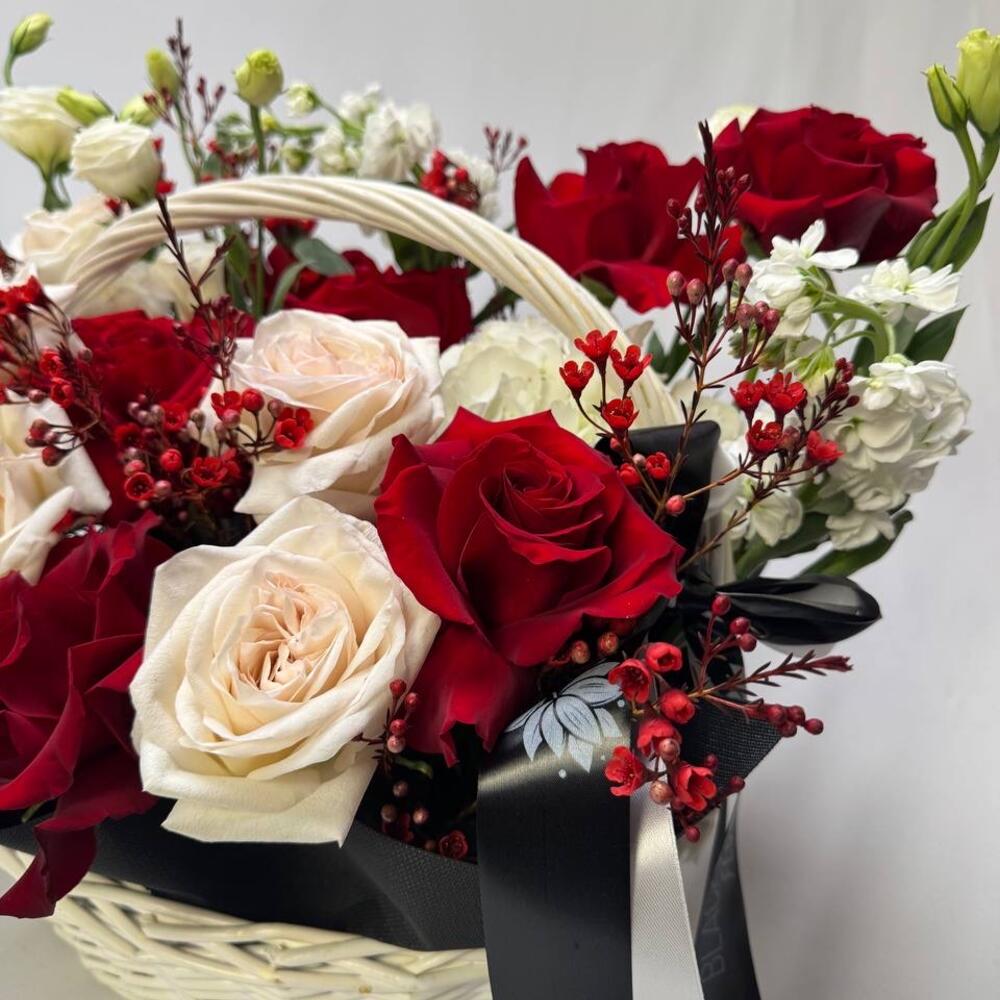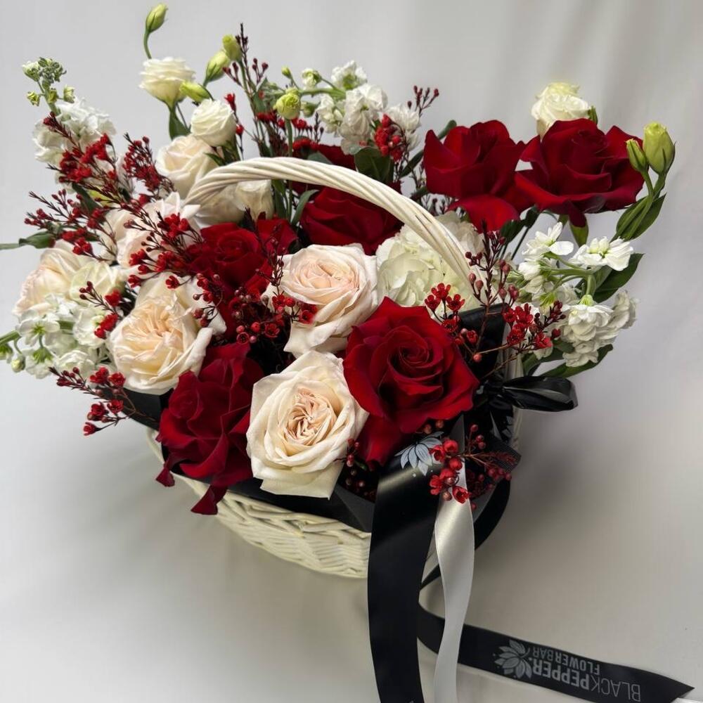 Этот великолепный композиционный ансамбль из цветов в корзине подарит незабываемые впечатления. Шикарную композицию из 7 восхитительных ваксфлауэров, 1 пышной гортензии, 13 роскошных роз и 4 изящных эустом определенно станет центром любого торжества. Эта роскошная корзина цветов - идеальное дополнение к любому подарку и замечательный способ выразить свои чувства.