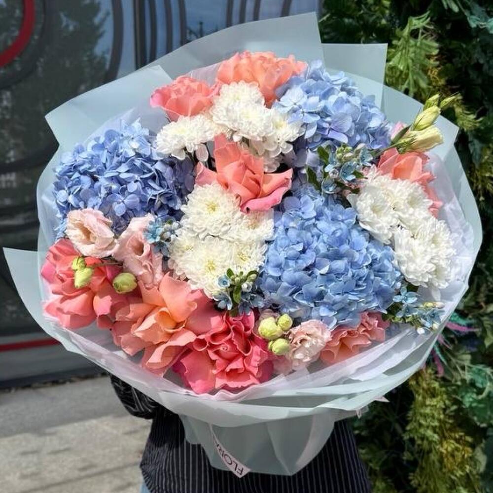 Обольстительный авторский букет, в комбинации с нежностью гортензий, утонченными лизиантусами, пышной кустовой хризантемой и яркими розами, создает уникальное цветочное произведение. Оттенки волшебные добавляют 4 стебля оксипеталума. Неповторимый букет, способный передать самые нежные и искренние эмоции, удивит и обрадует близких и любимых людей. Идеально подойдет в качестве подарка на любой праздник или просто чтобы подарить улыбку и хорошее настроение каждый день.