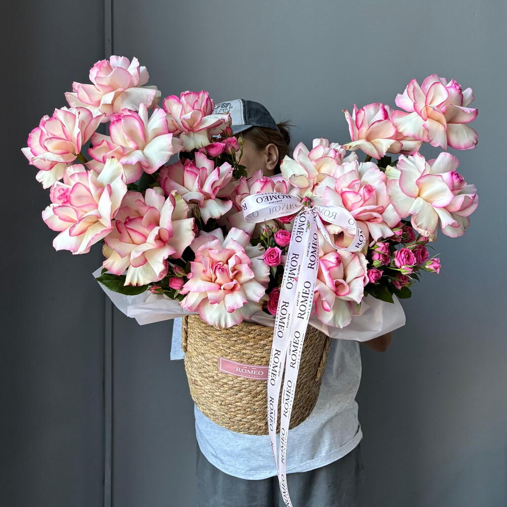 Кашпо - 1 дана Роза сортовая - 15 дана Флористикалық Оазис - 2 дана Спрей роза - 3 дана