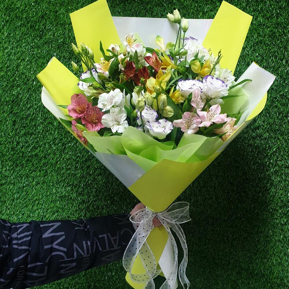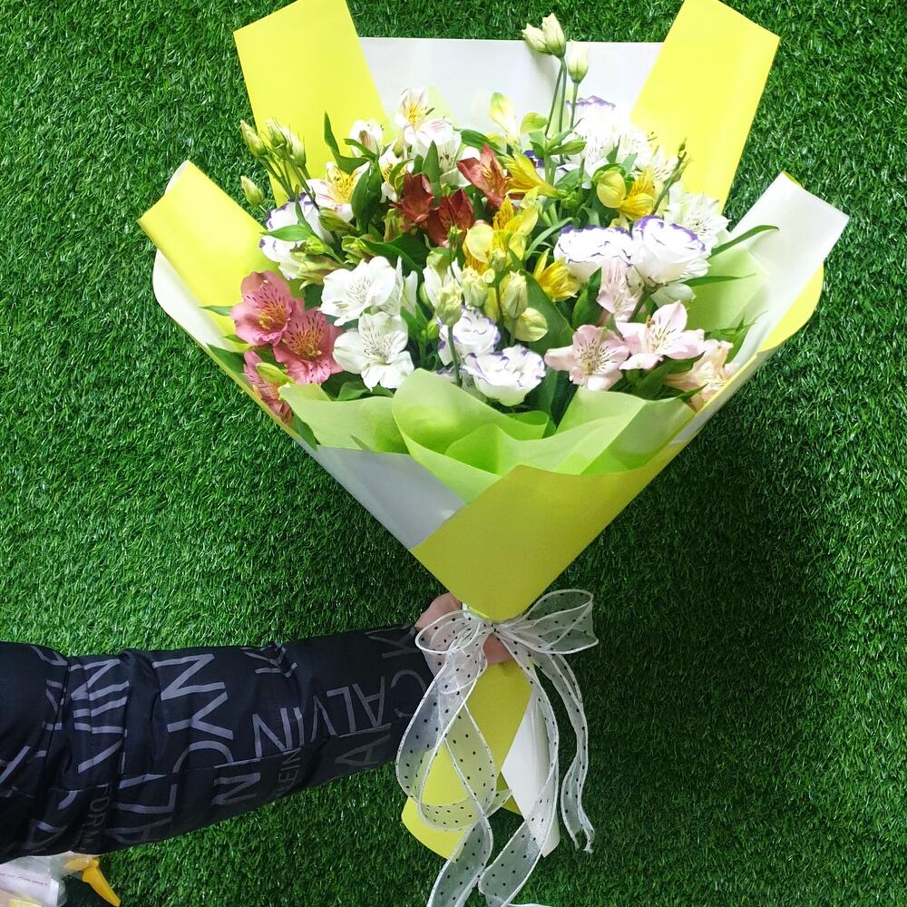 Флористическая упаковка - 1 дана Лизиантус розовый - 4 дана альстромерия микс - 11 дана