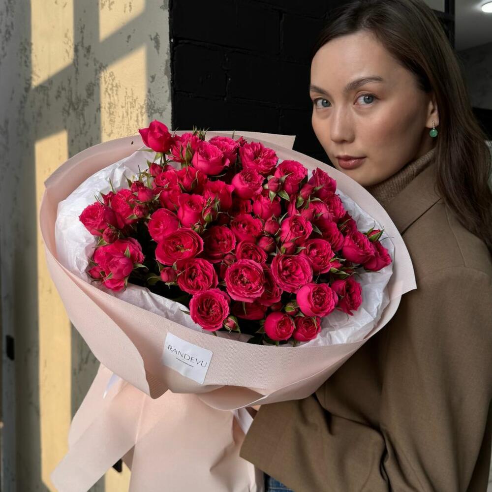 Сочный букет из малиновых кустовых роз, собранный в мягкую пастельную упаковку. Легкий, свежий и универсальный – для тех, кто любит простую, но выразительную красоту.
