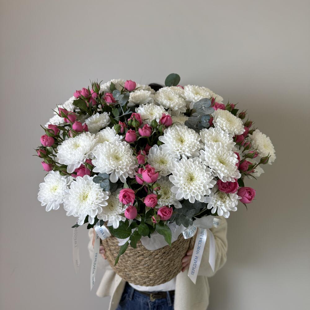 Белые хризантемы и алые кустовые розы в корзине соединяются в гармонию чистоты и страстного чувства.