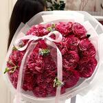 Пышные пионовидные розы глубокого малинового оттенка — как признание в чувствах. Этот букет дарит энергию, страсть и романтику, наполняя день особой нежностью.
