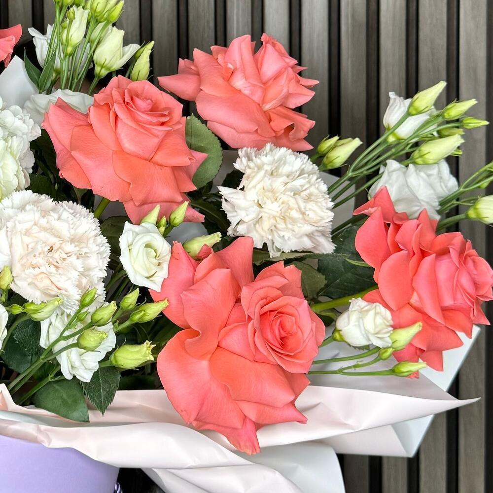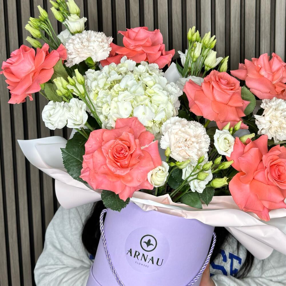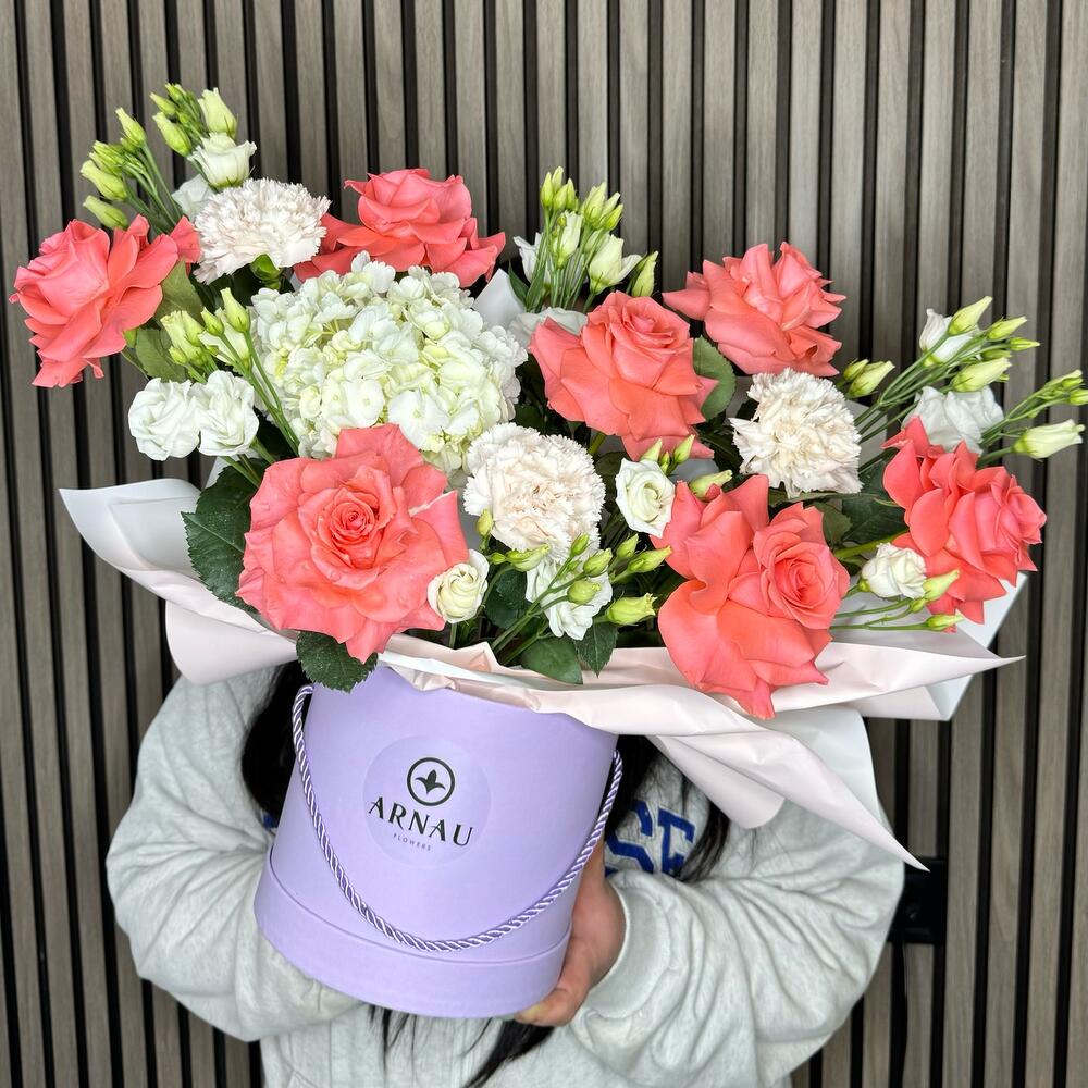 Гортензия - 1 дана Лизиантус - 5 дана Диантус - 4 дана Бас киім қорабы - 1 дана раушан - 7 дана
