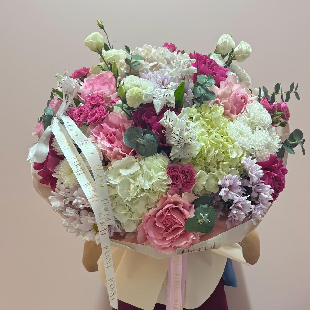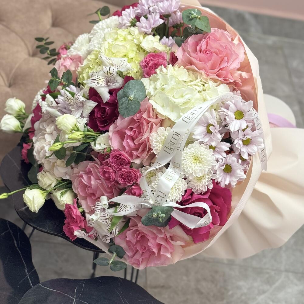 Лизиантус - 5 дана Эвкалипт - 2 дана Гортензия белая - 2 дана Қызғылт Гортензия - 3 дана раушан - 9 дана розы кустовые - 5 дана
