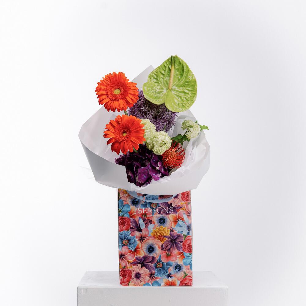 Антуриум - 1 дана Вибурнум - 1 дана Гербера - 2 дана Нутан - 1 дана Аллиум - 1 дана гортензия голландия - 1 дана