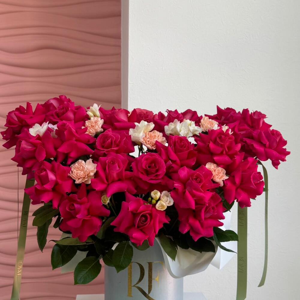 Роскошная композиция из ярко малиновых роз и нежно-розовых гвоздик. Идеальный выбор на любой случай.