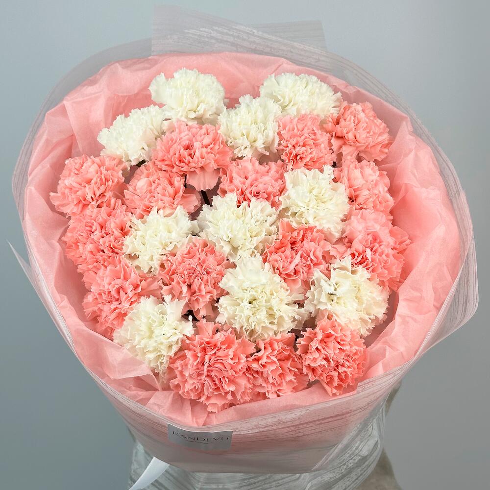 Легкий и воздушный букет из белоснежных и нежно-розовых гвоздик, напоминающий сладкое облако. Мягкие оттенки цветов, окруженные розовой упаковкой, создают атмосферу тепла и заботы. Этот букет станет идеальным подарком для тех, кто ценит утонченную простоту и искренность.