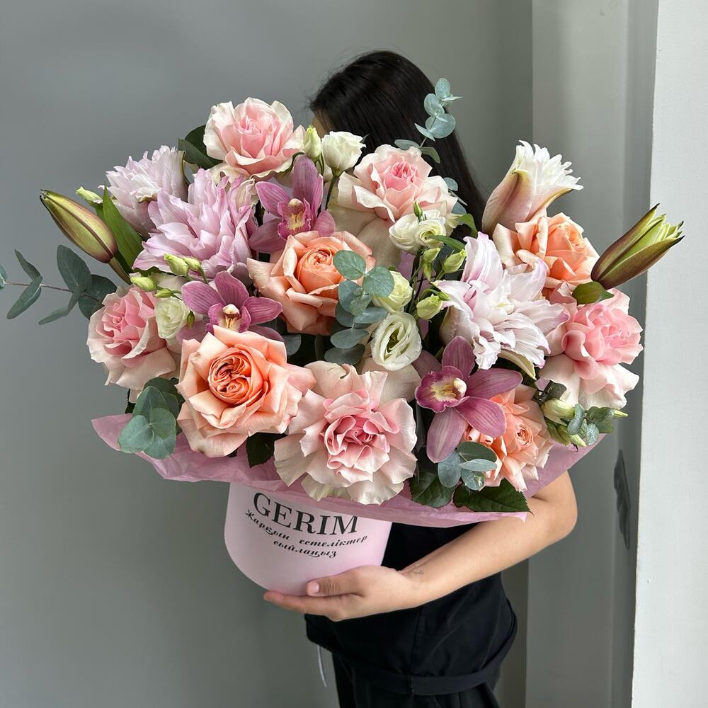 Эустома - 3 дана Эвкалипт Цинерея - 2 дана лилия пионовидная - 2 дана орхидеи цимбидиум - 3 дана розы голландские - 9 дана