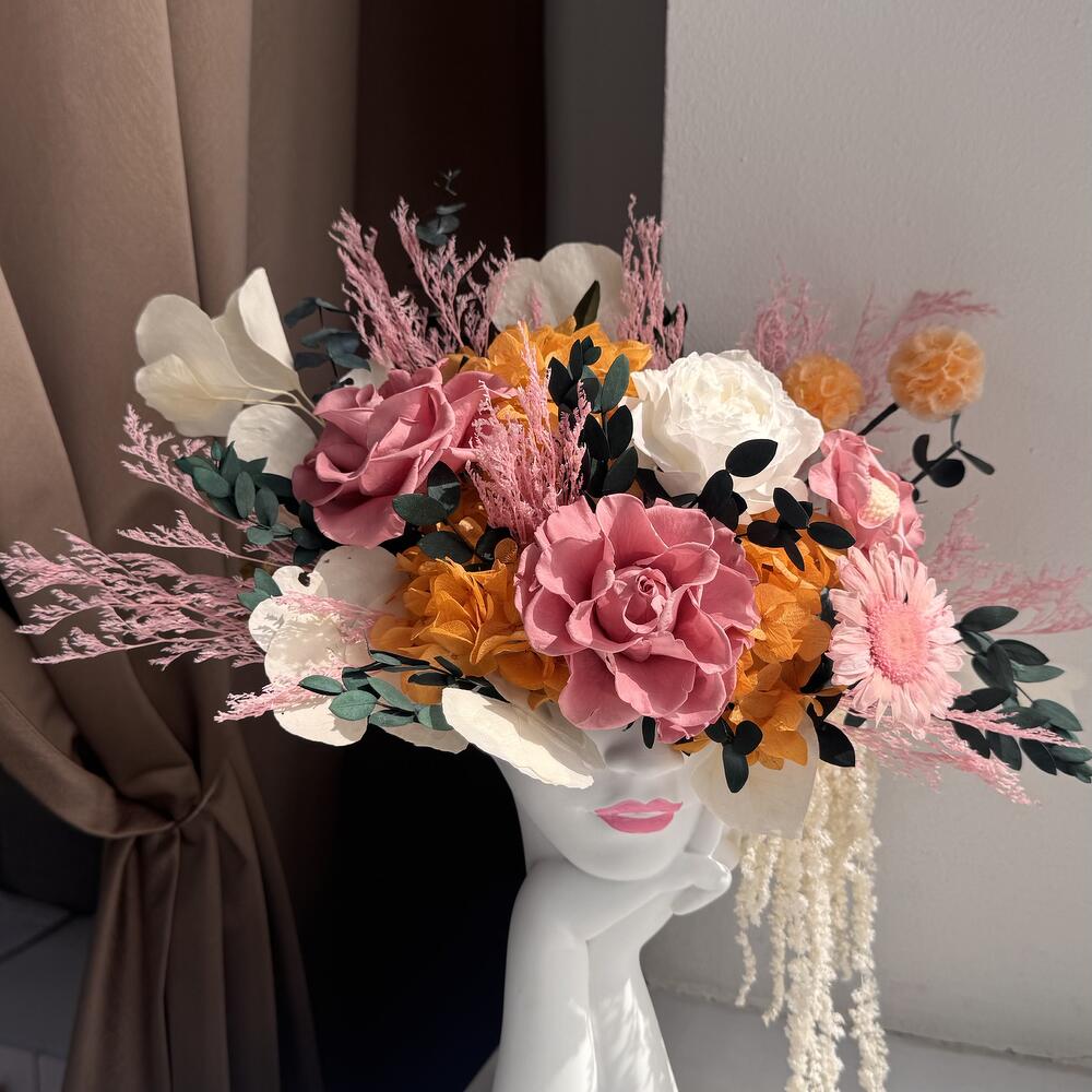 Диантус - 2 дана ваза в виде женской фигурки - 1 дана стабилизированный крупный пион - 1 дана стабилизрованные розовые розы - 5 дана стаблизированные зеленые гортензии - 5 дана ампельные зеленые ветви - 3 дана белые стабилизрованные бутоны - 3 дана