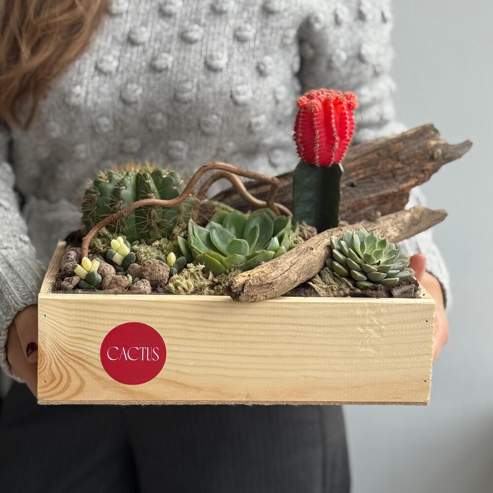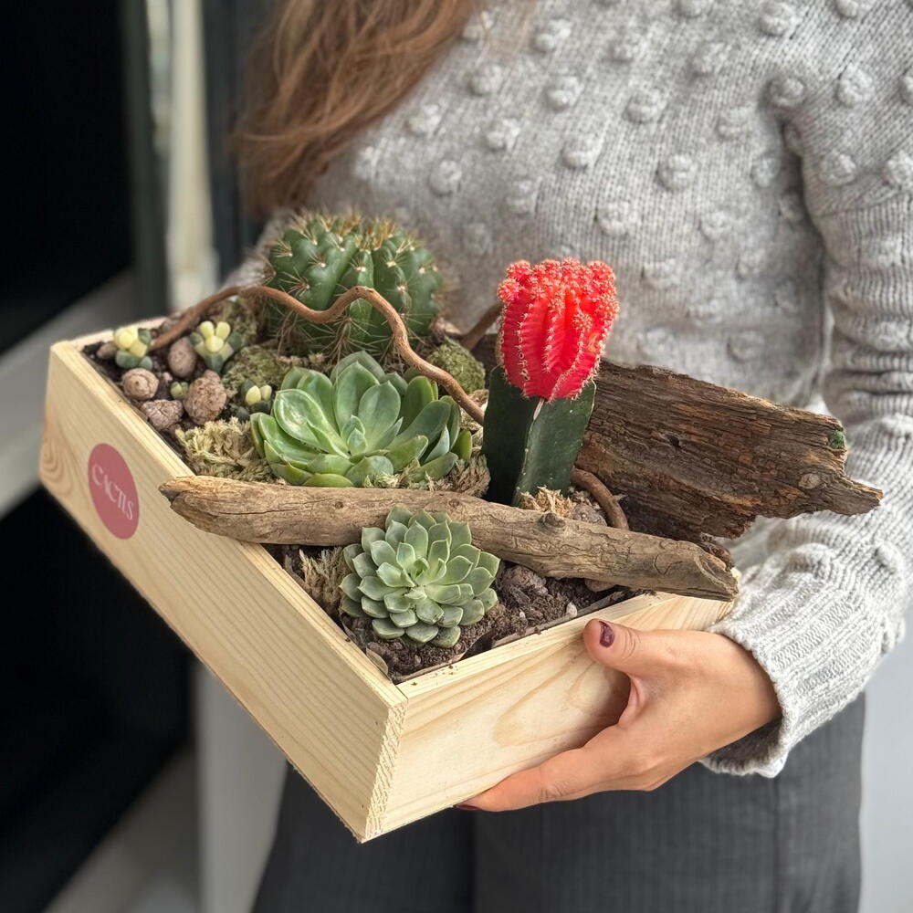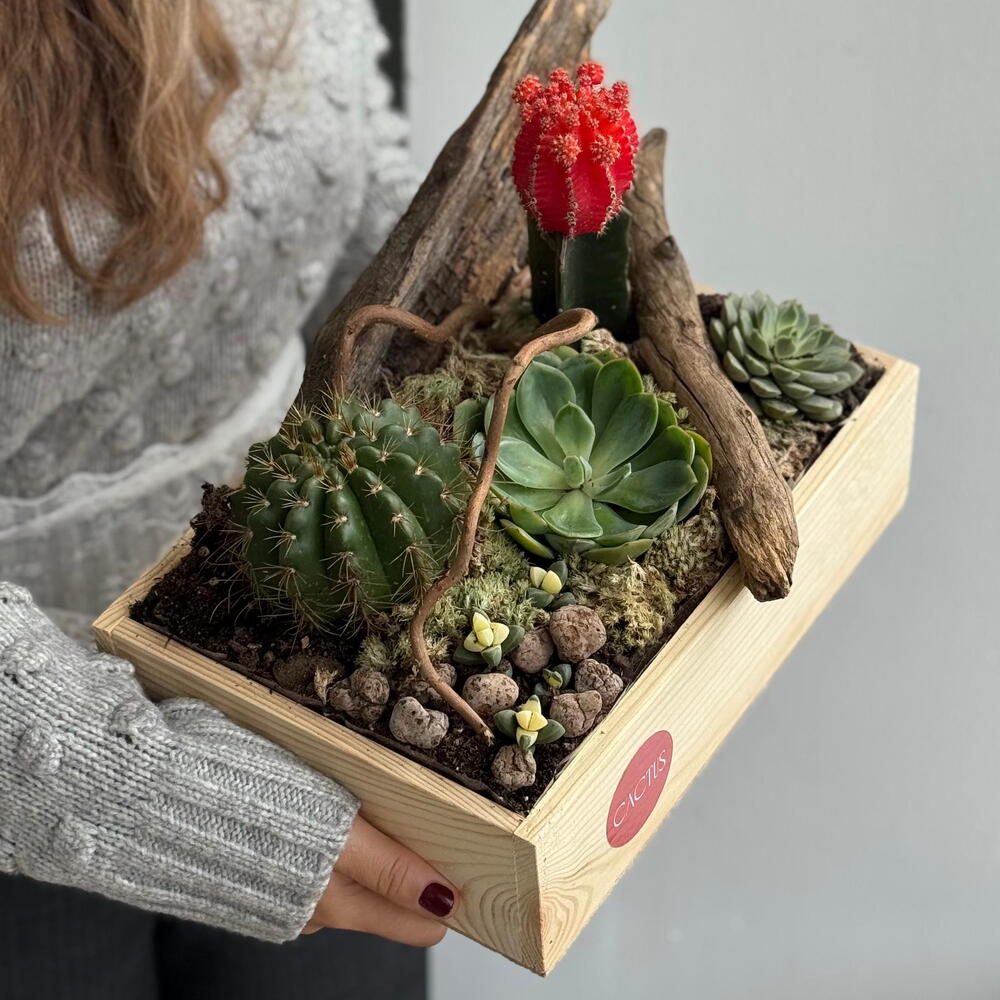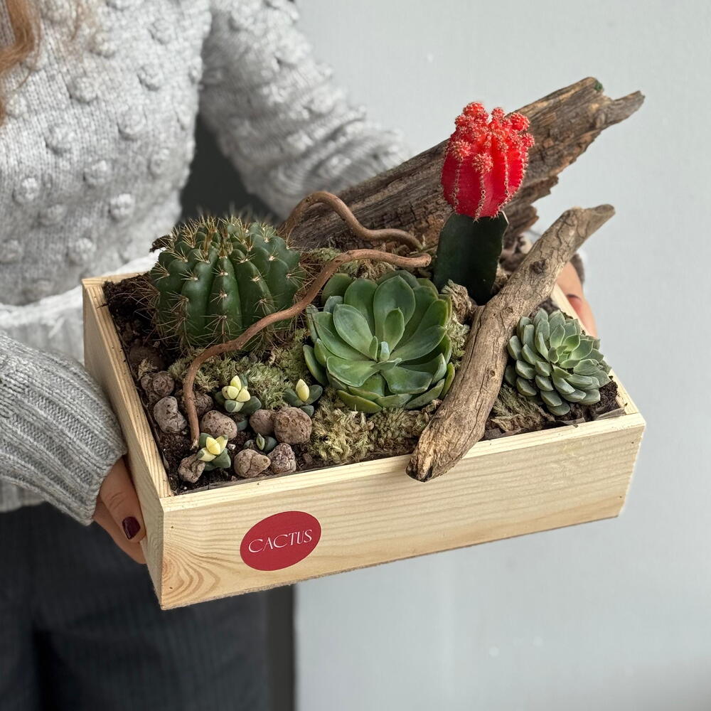 Флорариум в деревянном ящике с гимнокалициумом, цветущим кактусом и суккулентами