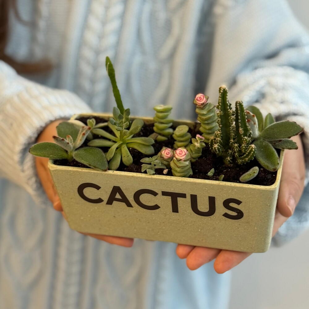 Мини сад из суккулентов и кактусов в прямоугольном кашпо