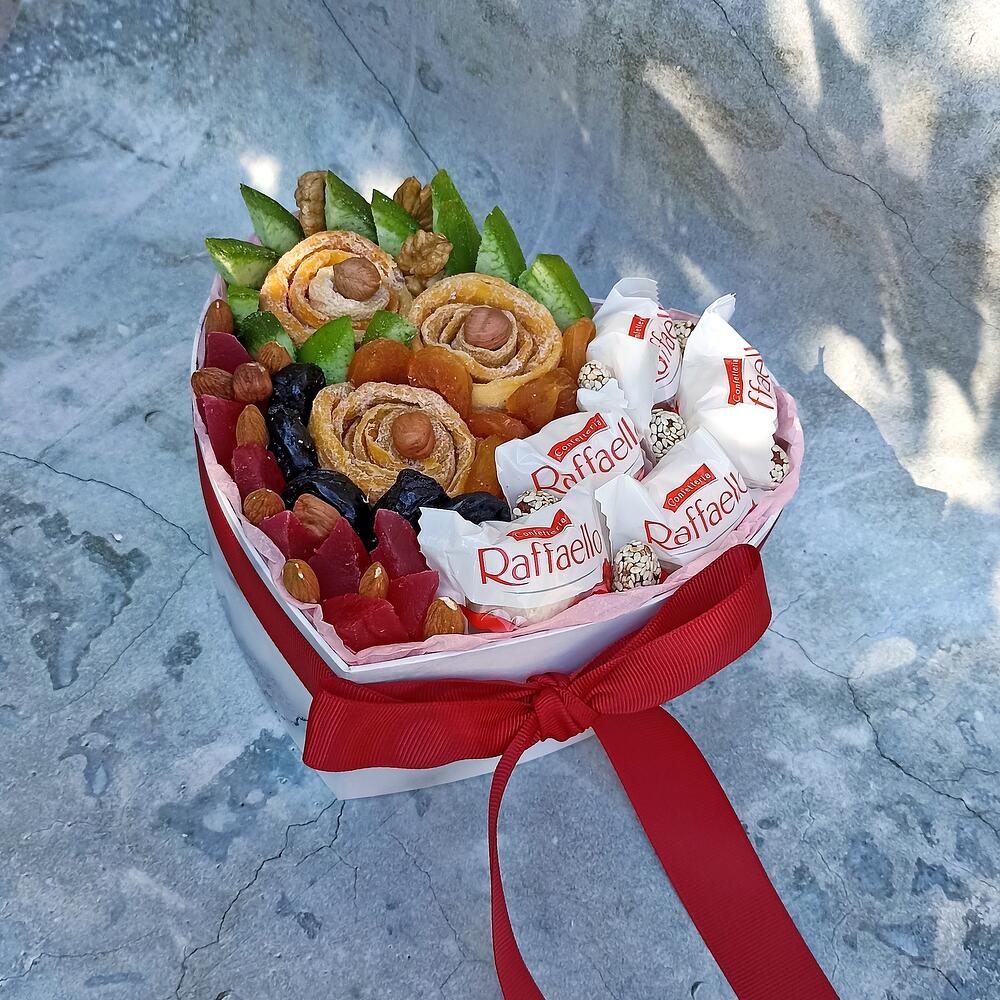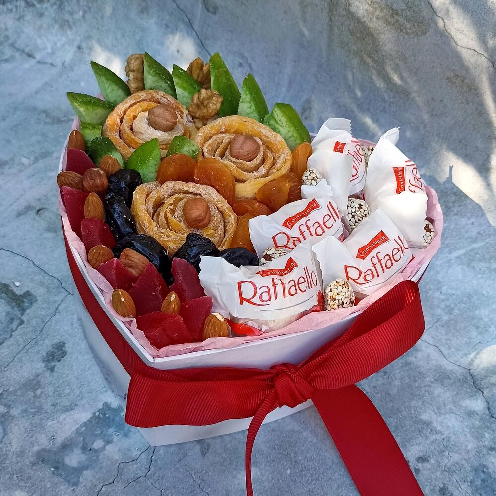 Раффаэлло - 5 дана Қорап - 1 дана Жаңғақ - 1 дана Фундук - 1 дана Курага - 7 дана Чернослив - 6 дана Манго сушеный - 3 дана папайя сушеная - 8 дана арахис в кунжуте) - 1 дана цукат помело - 11 дана орехи очищенные ( миндаль - 100 гр.