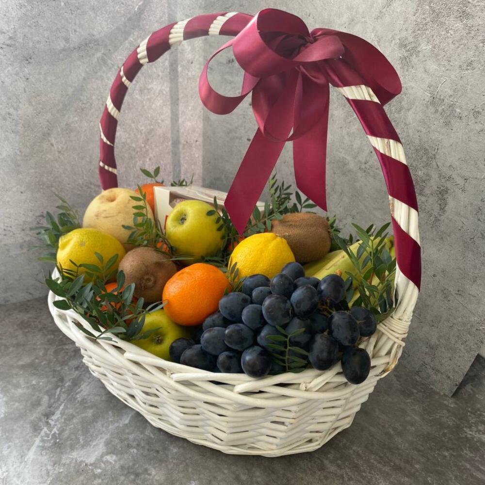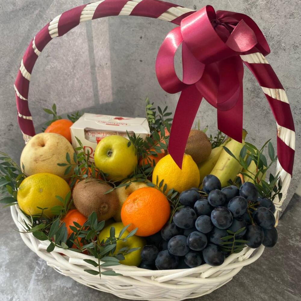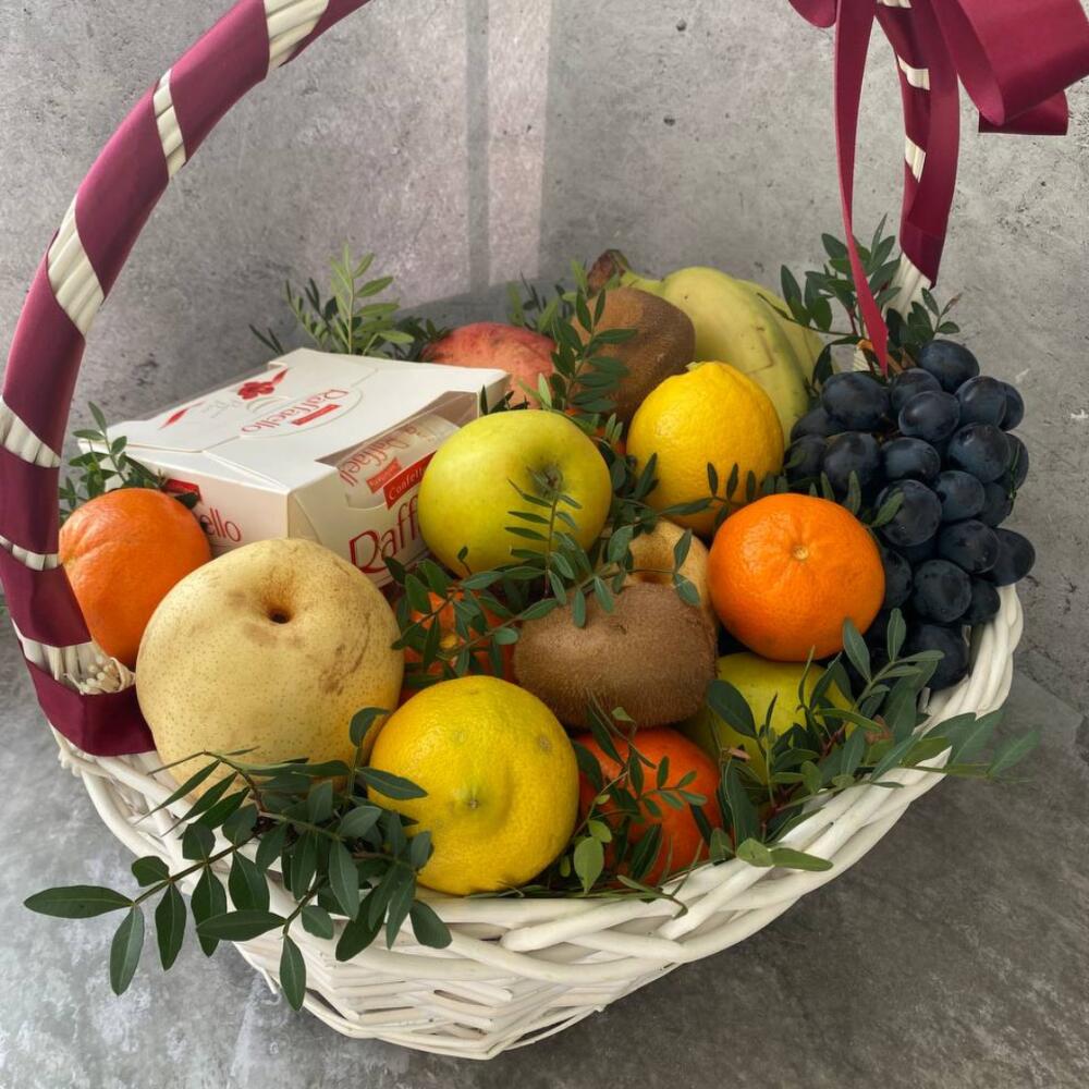 Корзина - 1 дана Раффаэлло - 150 гр. Виноград - 500 гр. Банан - 4 дана Гранат - 1 дана Киви - 5 дана Мандарин - 5 дана Лимон - 2 дана Груша - 3 дана Яблоки - 4 дана