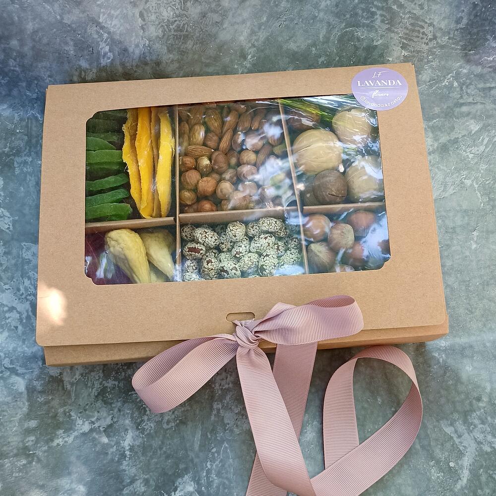 Киви - 10 дана Қорап - 1 дана Жаңғақ - 100 гр. Папайя - 5 дана Бадам - 100 гр. Фундук - 150 гр. Курага - 150 гр. Манго сушеный - 5 дана фундук в скорлупе - 200 гр. қабықтағы макадамия - 5 дана күнжіттегі жержаңғақ - 200 гр. груша сухофрукт - 5 дана