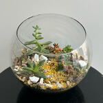 Чтобы пустынный флорариум долго вас радовал, пожалуйста: • Суккулентам требуется много света,но в жаркий летний период их нужно убрать с прямых солнечных лучей. В летний период флорариум поливается раз в одну-две недели. В остальное время поливается раз в три недели. Полив производится под каждый цветок шприцом или ложкой, чтобы не испортить дизайн флорариума.