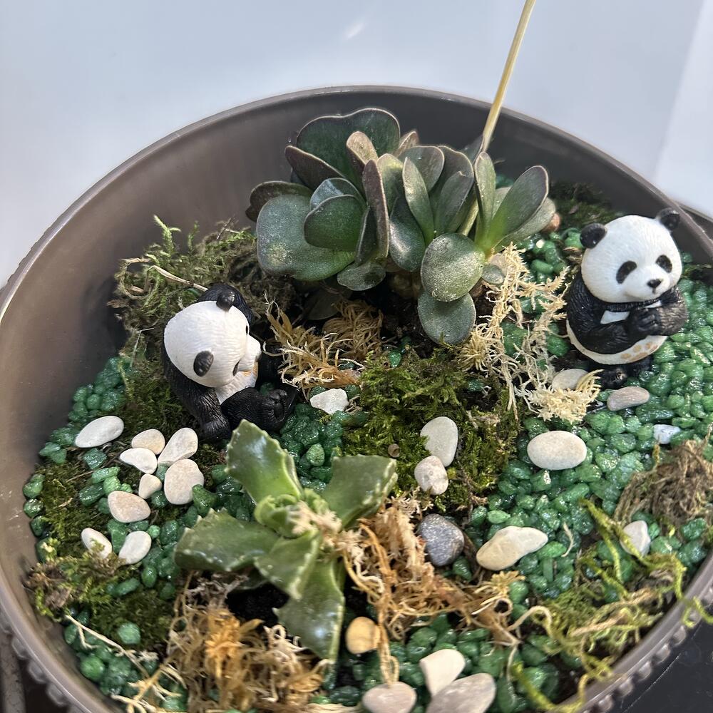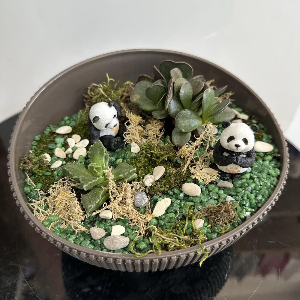 Флорариум Панда-сад 🐼🌿 Очаровательная миниатюрная композиция в стильной круглой плошке. Внутри – живые суккуленты, декоративный мох, камешки и две милые фигурки панд, создающие атмосферу уюта и сказки. Идеально подходит для декора рабочего стола, подоконника или в подарок тем, кто любит необычные и живые украшения интерьера. Компактный размер позволяет разместить флорариум даже в небольшом пространстве. Состав: Живые суккуленты Декоративный мох и зелёный грунт Натуральные камешки 2 фигурки панд Пластиковая чаша Уход: Минимальный. Полив 1 раз в 10–14 дней, размещение в светлом месте без прямых солнечных лучей.