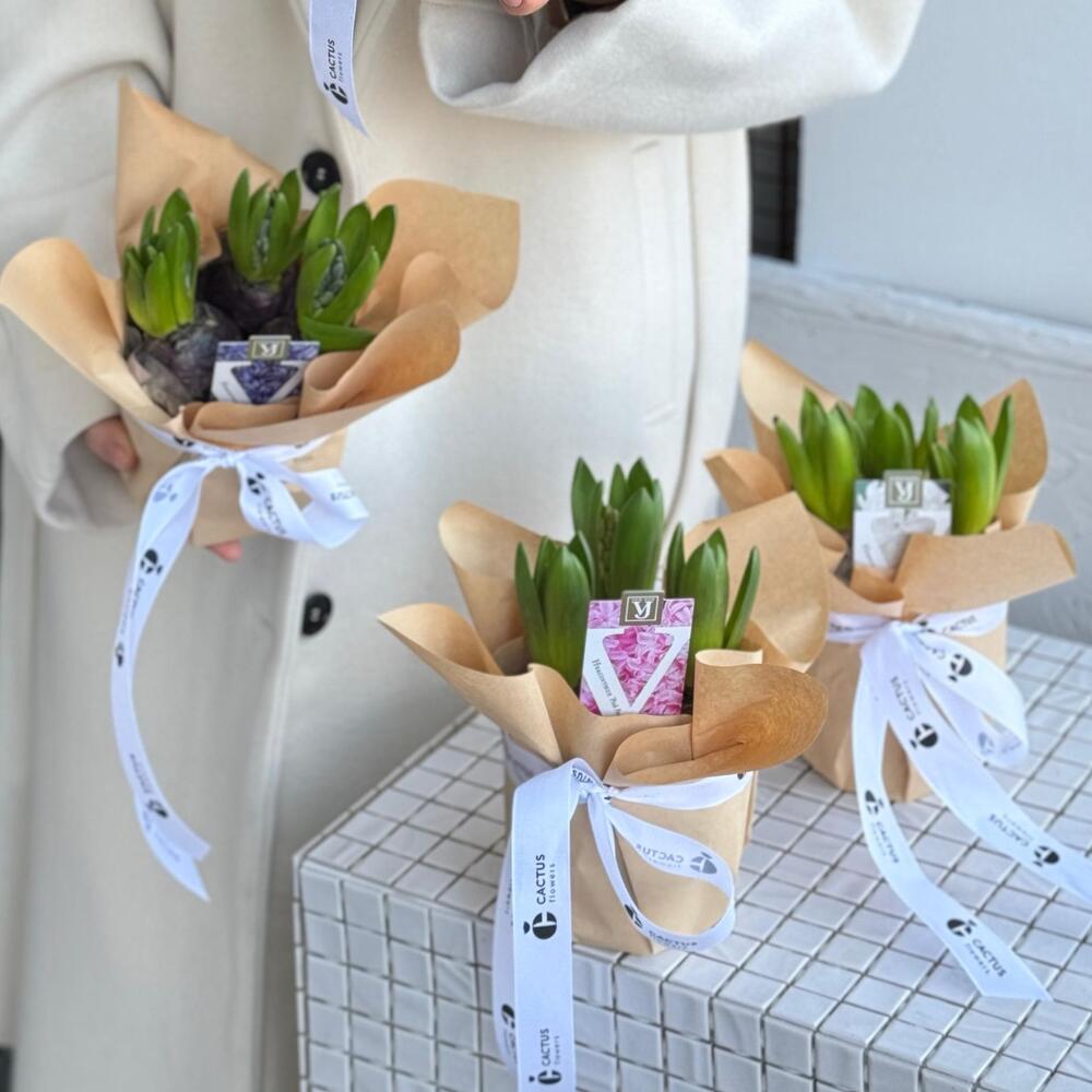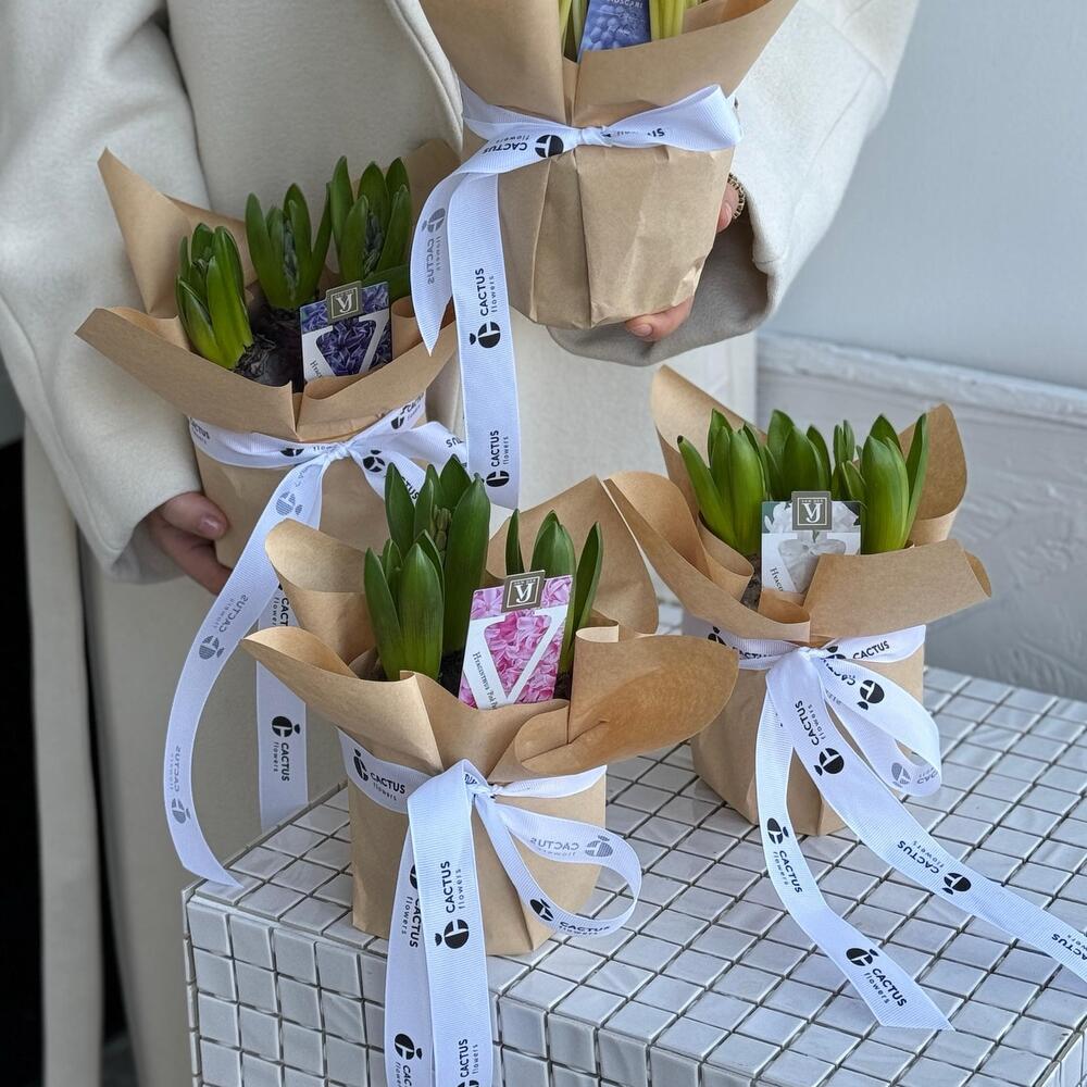 Весенние первоцветы в подарочной упаковке - ароматные гиацинты в горшках. Раскроются у вас на глазах. Дарите весну!