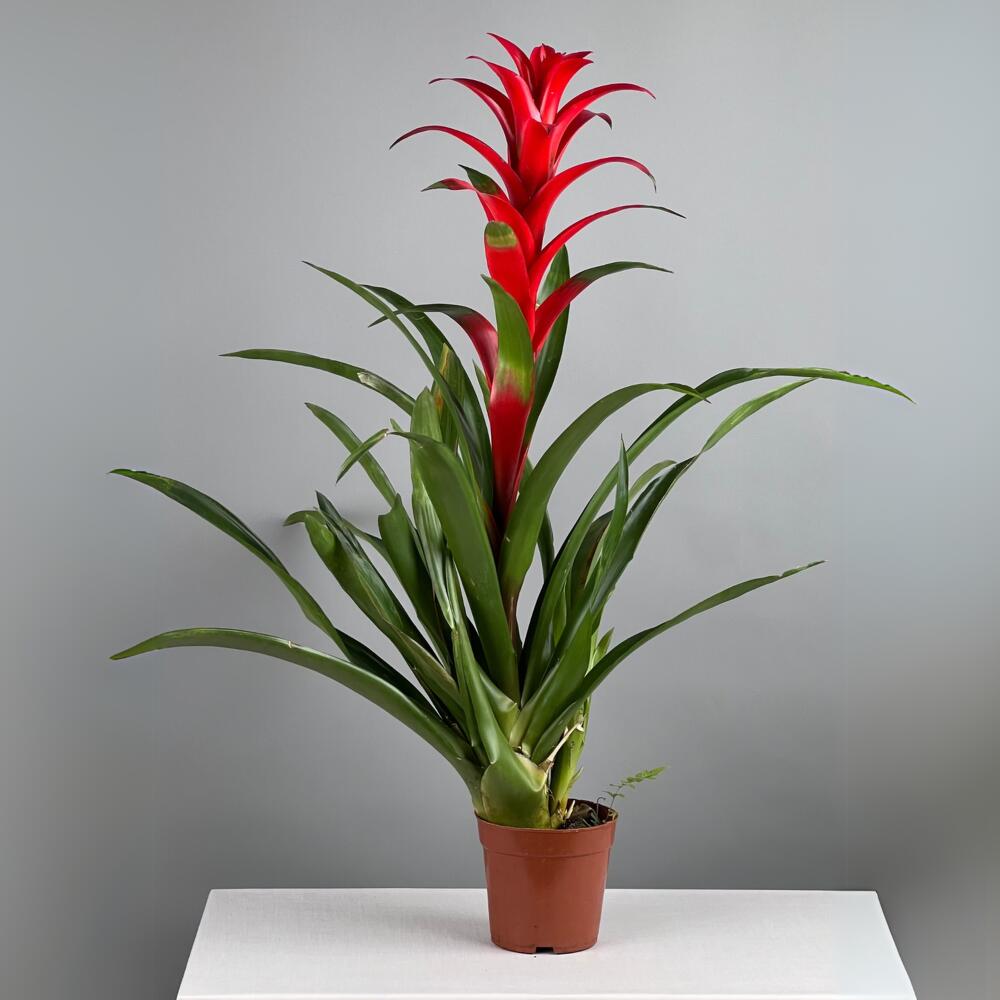 Гузмания в горшке, высота 65 см — яркое украшение интерьера. Экзотическое растение с сочными листьями и ярким прицветником. Подходит для дома, офиса или в подарок. Не требует сложного ухода.