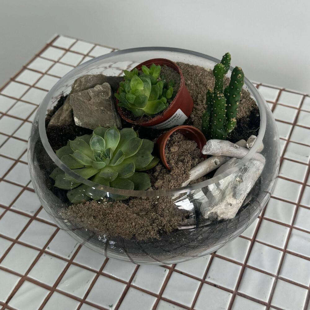 Флорариум с суккулентами микс Суккуленты — это разнообразная группа растений, объединенная способностью накапливать воду в своих мясистых листьях или стеблях, что позволяет им выживать в засушливых условиях. Название происходит от латинского слова sucus, означающего сочный. Они не имеют общего происхождения, но схожи по признакам, вызванным условиями обитания. К ним относятся кактусы, алоэ, литопсы и многие другие виды из различных ботанических семейств.