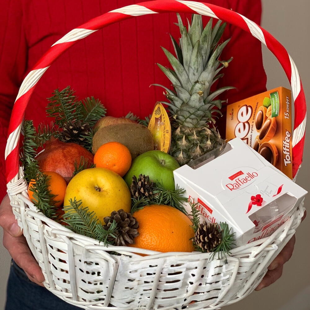 Ель нобилис - 2 шт. Ананас - 1 шт. Гранат - 1 шт. Киви - 1 шт. Апельсин - 1 шт. Мандарин - 2 шт. Rafaello - 1 шт. toffifee - 1 шт. Яблоки - 3 шт. Шишка Ели - 4 шт.