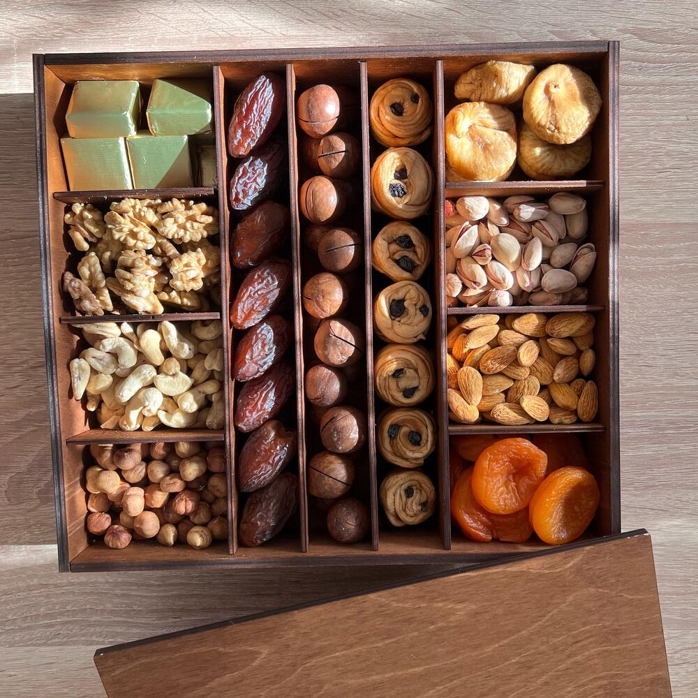 Фисташка - 100 гр. Грецкий орех - 100 гр. Миндаль - 100 гр. Фундук - 100 гр. Курага - 200 гр. Инжир сушеный - 100 гр. дыня сушеная - 7 шт. макадамия в скорлупе - 200 гр. финики королевские - 200 гр. птичье молоко - 5 шт.