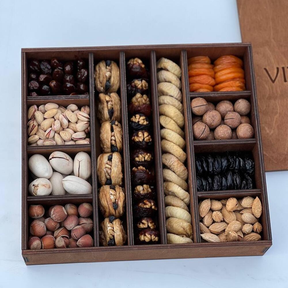 Инжир - 250 гр. Ferrero rocher - 8 шт. Миндаль - 150 гр. Фундук - 150 гр. Курага - 200 гр. Чернослив - 150 гр. Финики - 200 гр. Фисташки соленые - 200 шт. пекан - 120 гр. бразильский орех - 150 гр. хаштаг - 250 гр.