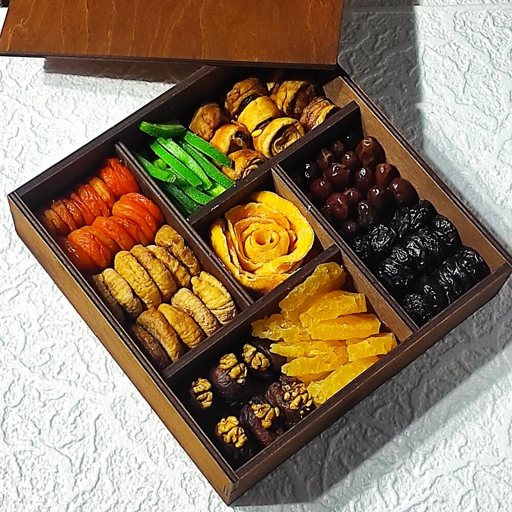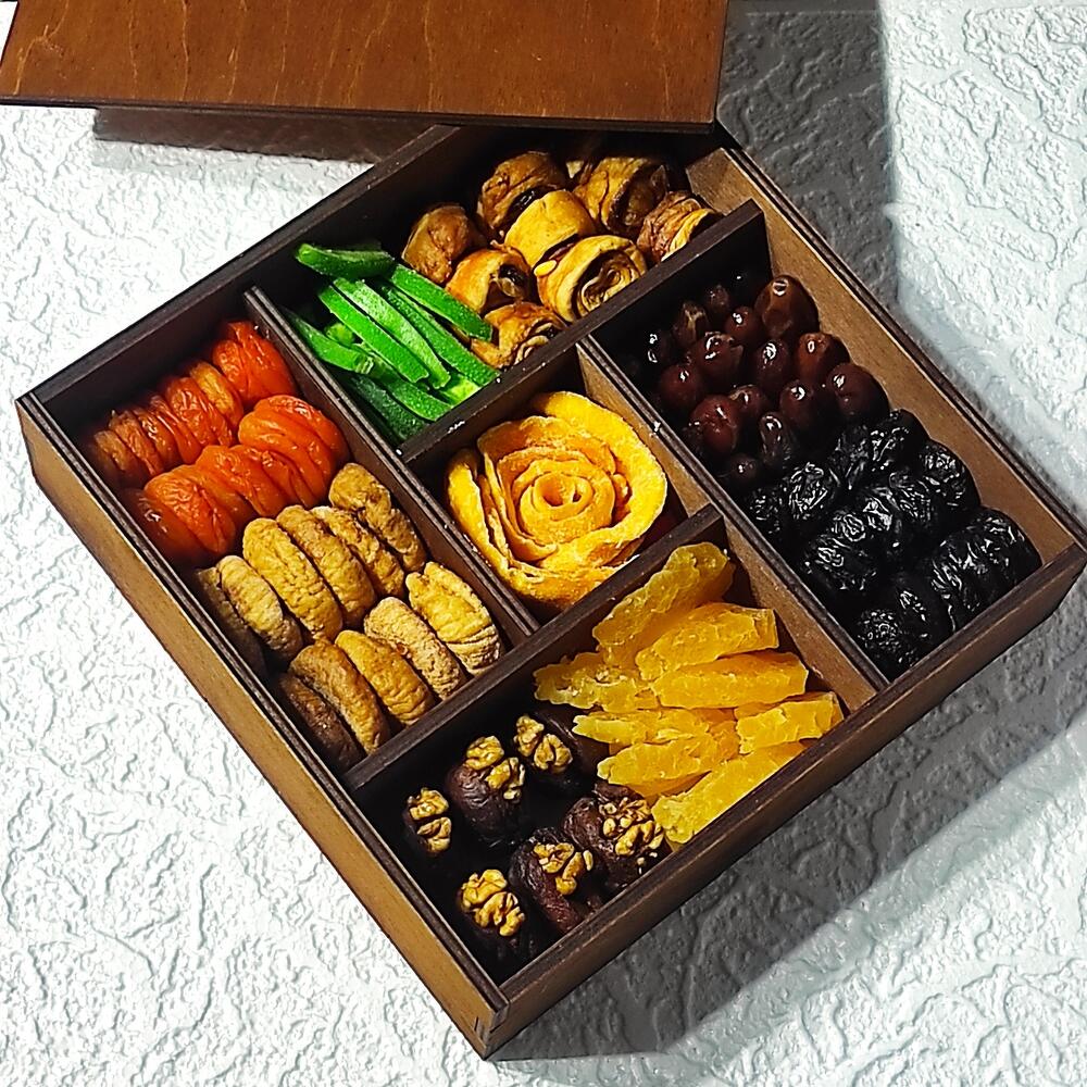 Бокс выполнен из высококачественной фанеры. Самые вкусные сухофрукты в одном наборе.