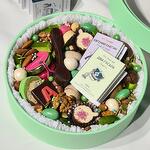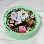 Замечательная шляпная коробка с шикарным наполнением. Орехи, сухофрукты, конфеты с ароматными начинками, шоколадные цифра и ложка из бельгийского шоколада, драже и главная фишка набора: чай со смыслом! В мини брошюре ,кроме ароматного чая ,вы увидите цитаты из знаменитых произведений, которые, возможно ,сподвигнут вновь их перечитать. Дарите красиво , удивляйте !