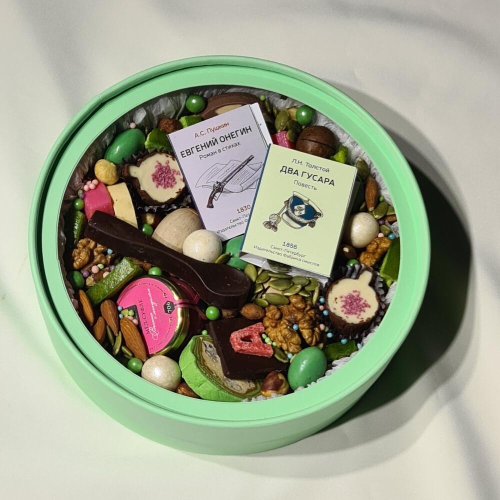 Замечательная шляпная коробка с шикарным наполнением. Орехи, сухофрукты, конфеты с ароматными начинками, шоколадные цифра и ложка из бельгийского шоколада, драже и главная фишка набора: чай со смыслом! В мини брошюре ,кроме ароматного чая ,вы увидите цитаты из знаменитых произведений, которые, возможно ,сподвигнут вновь их перечитать. Дарите красиво , удивляйте !