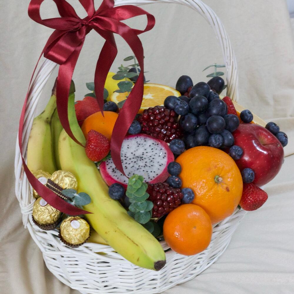 Клубника - 3 шт. Эвкалипт - 3 шт. Виноград - 1 шт. Банан - 3 шт. Гранат - 1 шт. Яблоко - 200 гр. Апельсин - 2 шт. Мандарин - 2 шт. Голубика - 100 гр. ферреро роше - 3 шт. драконий фрукт - 1 шт.
