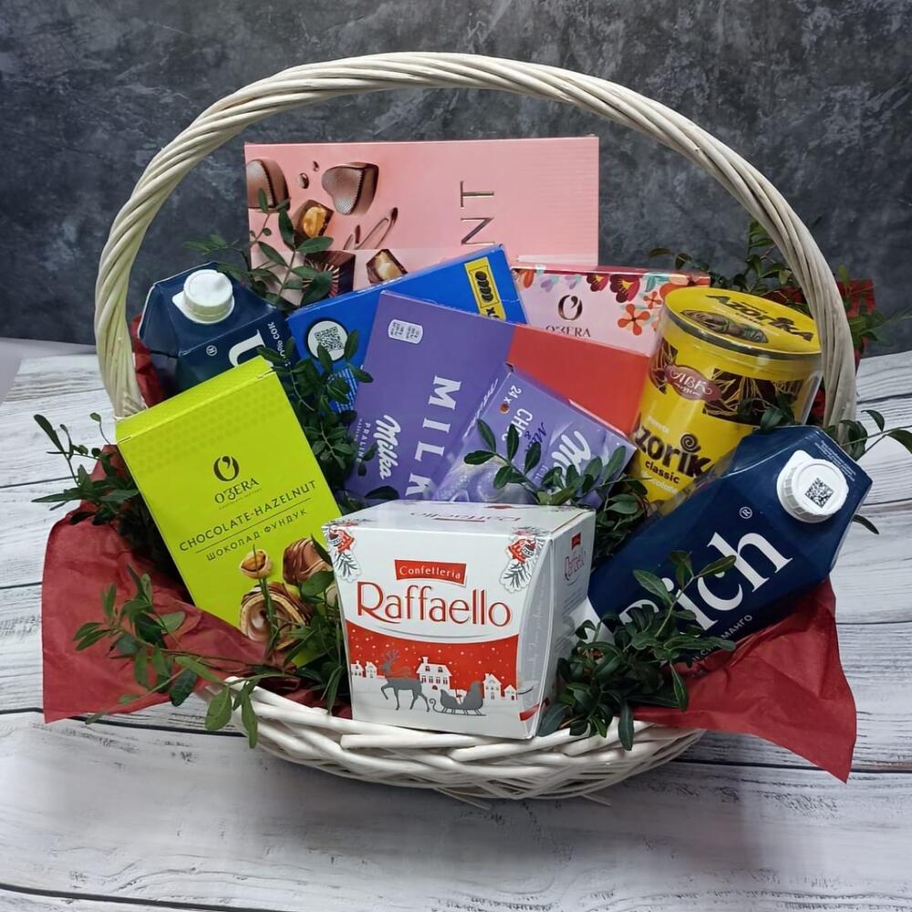 Корзина - 1 шт. Раффаэлло - 1 шт. коробка конфет ассорти - 1 шт. сок rich - 2 шт. милка набор конфет - 2 шт. орео коробка - 1 шт. набор конфет шоколадных - 3 шт.