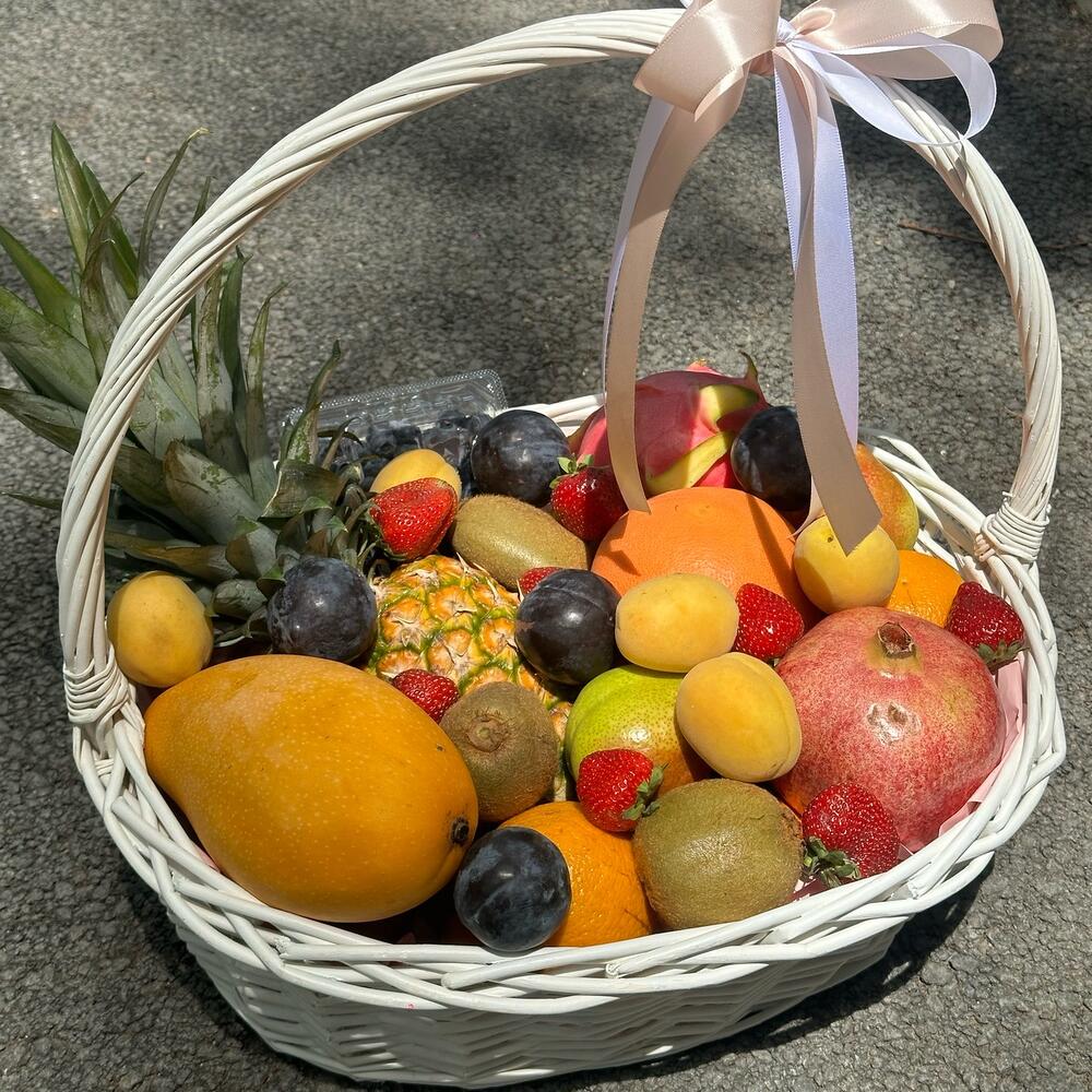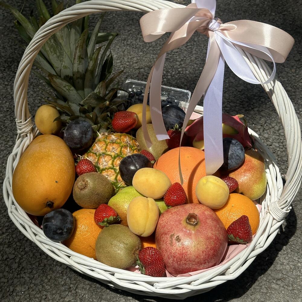 Клубника - 8 шт. Ананас - 1 шт. Киви - 4 шт. Яблоко - 1000 гр. Апельсин - 3 шт. Груша - 2 шт. Слива - 5 шт. манго - 1 шт. Грейпфрут - 1 шт. Абрикос - 6 шт. Драгон фрукт - 1 шт. граната - 1 шт. голубик - 150 гр.