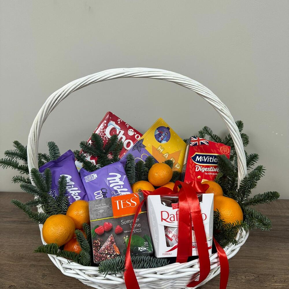 Раффаэлло - 1 шт. Апельсин - 1000 гр. Печенье - 1 шт. мандарин фрукт - 1000 гр. Чокопай - 350 гр. милка шоколад - 200 гр. милка печенье - 200 гр. чай тесс - 1 шт.