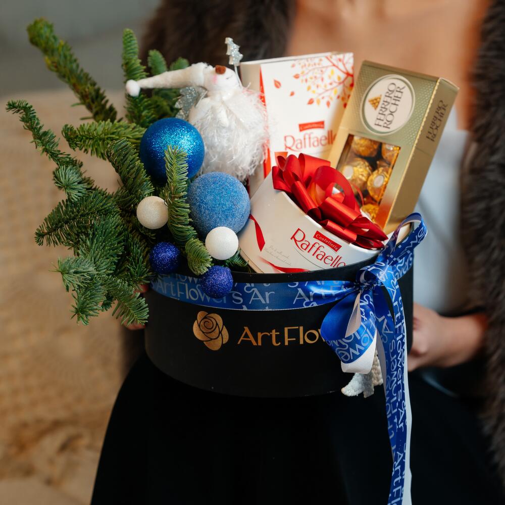 Оазис - 1 шт. Коробка - 1 шт. Нобилис - 1 шт. Игрушка гном - 1 шт. шар средний - 4 шт. раффаэлло 100гр - 1 шт. раффаэлло 200гр - 1 шт. шар мелкий - 5 шт. конфеты ferrero 200 гр - 1 шт.