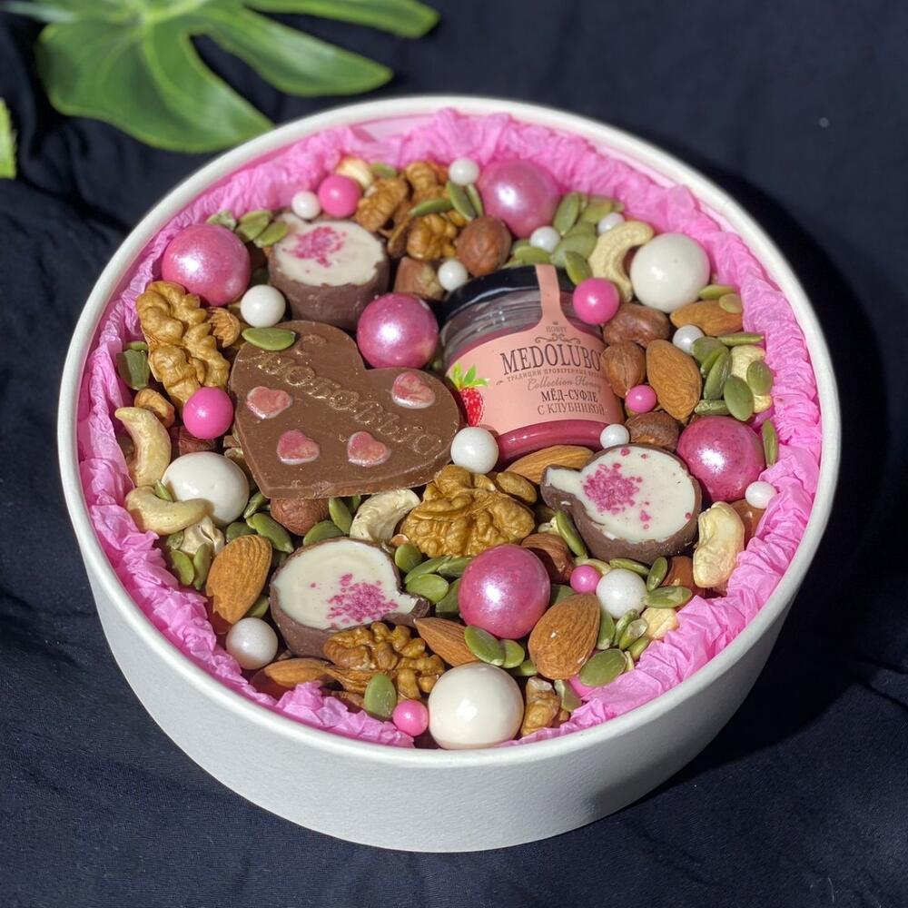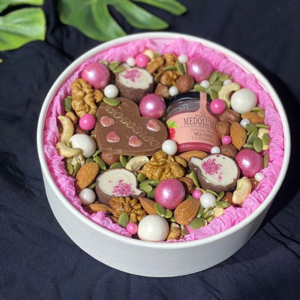 Кешью - 63 гр. Мед суфле - 1 шт. Фундук - 102 гр. Шоколадная открытка - 1 шт. тыквенные семечки - 15 гр. рисовые шарики - 10 гр. миндаль чищенный - 100 гр. конфеты стильные штучки - 3 шт. драже шоколадные - 45 гр. грецкий чищенный - 72 гр.
