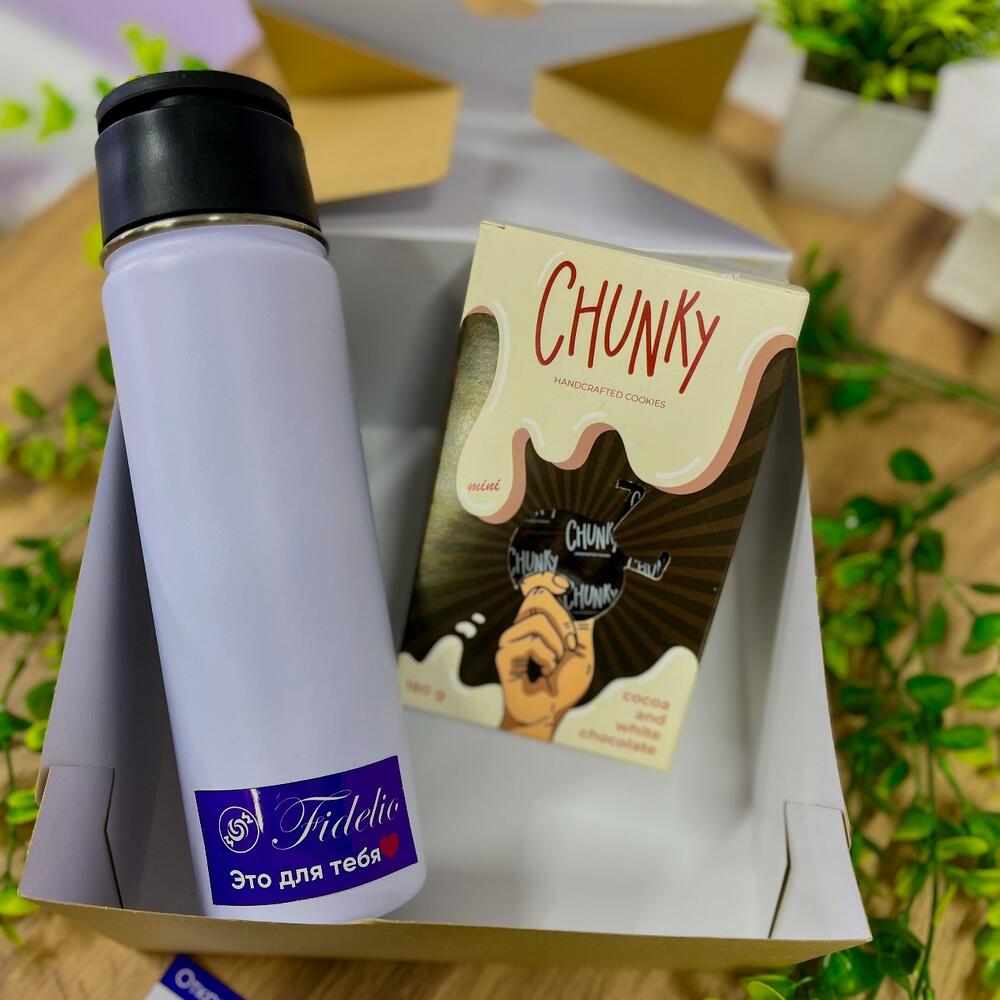 Набор «Термос + mini chunky» — стильное сочетание заботы и уюта. Удобный термос сохранит любимый напиток горячим, а мини-бокс с десертами chunky порадует ярким вкусом и подарит настроение. Отличный вариант для подарка или для того, чтобы порадовать себя.