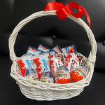 Открытка - 1 шт. Корзина плетеная - 1 шт. Kinder bueno - 2 шт. Kinder сюрприз - 4 шт. Kinder delice - 2 шт. Kinder chocolate - 4 шт.