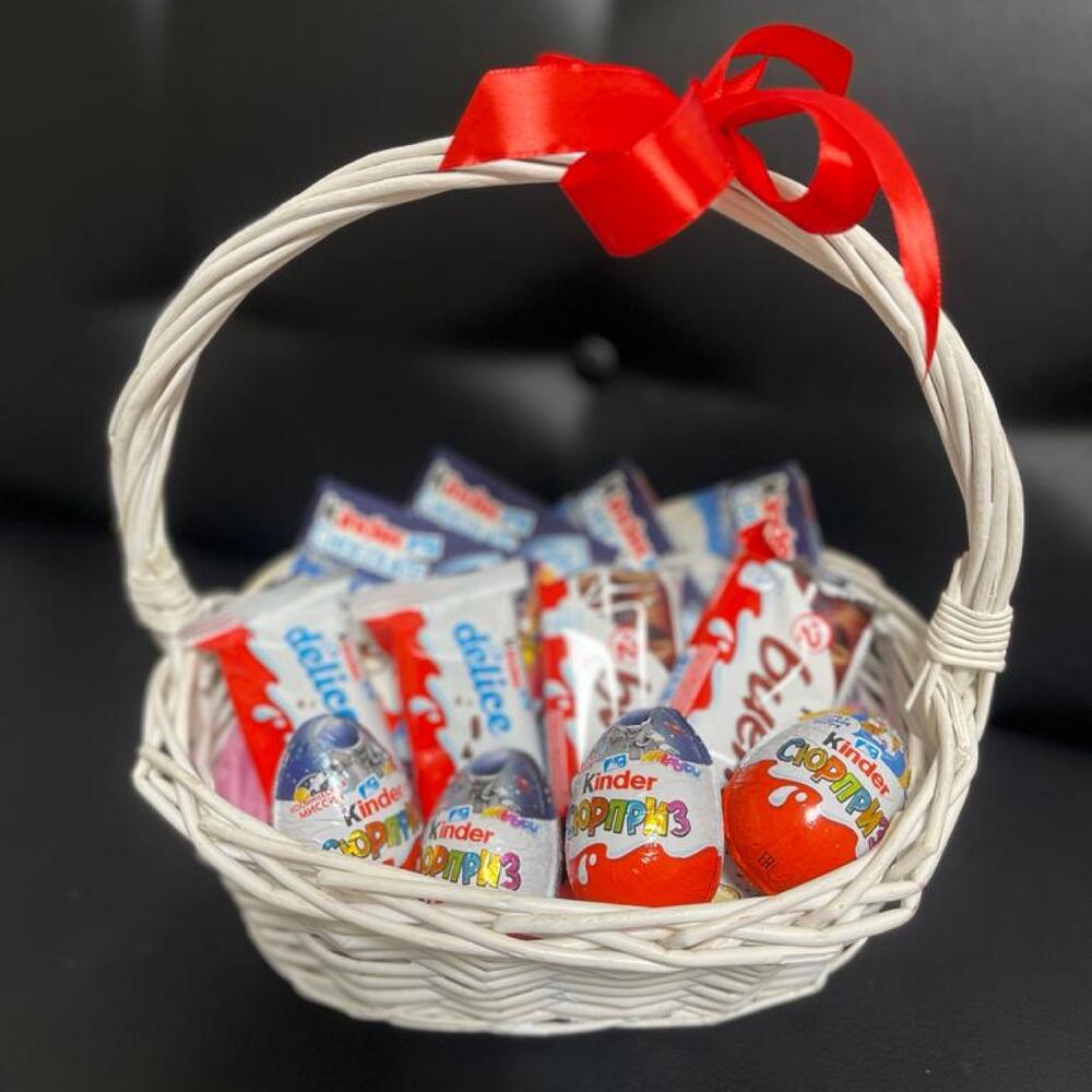 Открытка - 1 шт. Корзина плетеная - 1 шт. Kinder bueno - 2 шт. Kinder сюрприз - 4 шт. Kinder delice - 2 шт. Kinder chocolate - 4 шт.