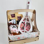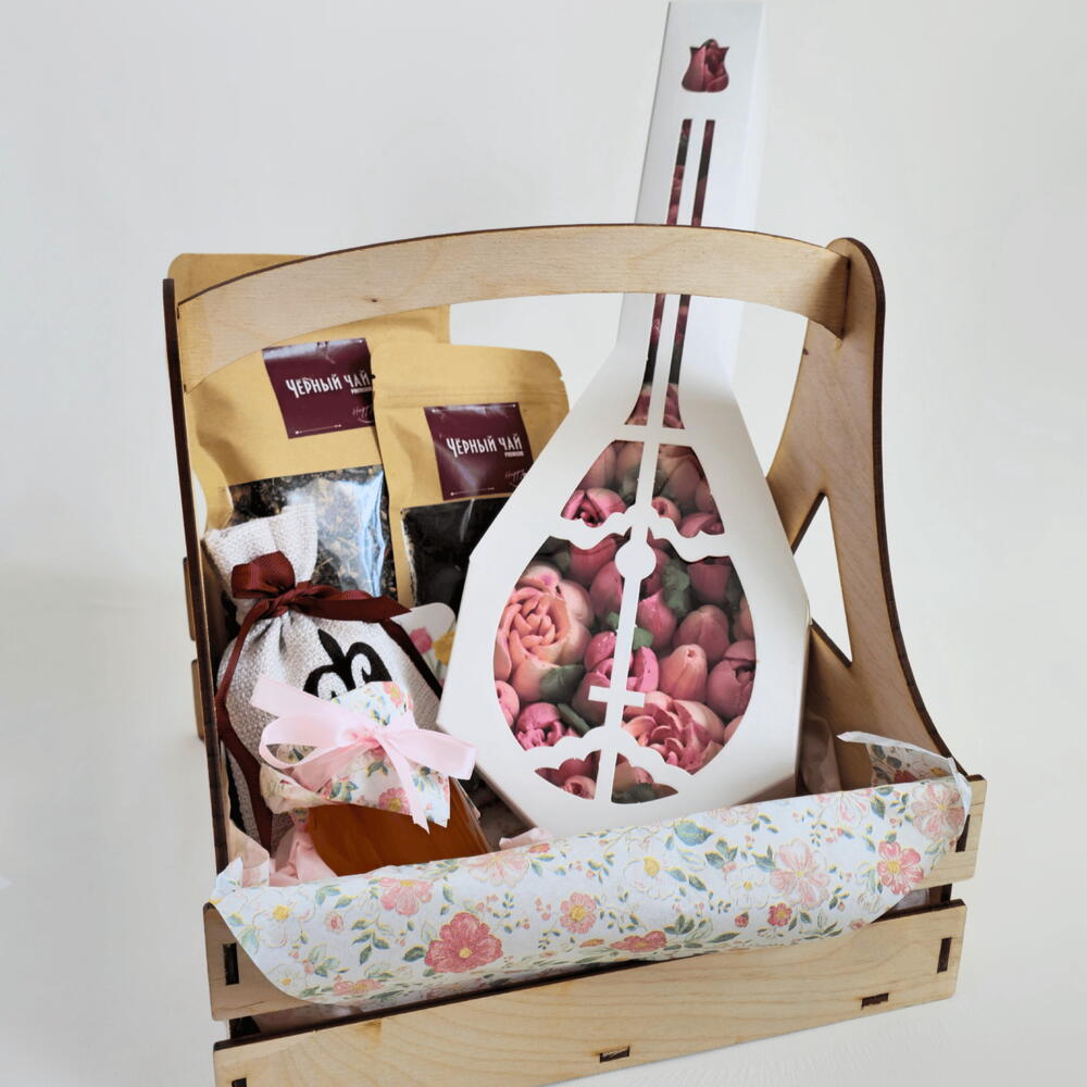 Мед - 150 гр. чай черный с натуральными добавками - 100 гр. чай зеленый с натуральными добавками - 50 гр. орешки в глазури - 100 гр. корзина ящик из фанеры - 1 шт. мешочек с орнаментом - 1 шт. зефир в коробке домбра - 350 гр.