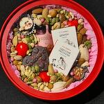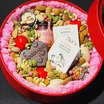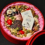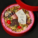 Кешью - 35 гр. Миндаль - 43 гр. Мед суфле - 1 шт. Фундук - 40 гр. шоколадка ручной работы - 13 гр. фундук в скорлупе - 40 гр. макадамия в скорлупе - 35 гр. грецкий орех в скорлупе - 36 гр. миндаль в скорлупе - 84 гр. пекан в скорлупе - 35 гр. драже шоколадное - 37 гр. фисташка орех в скорлупе - 47 гр. рисовые шарики - 3 гр. тыквенные семечки очищенные - 15 гр. кедровые орехи - 6 гр. стильные штучки ( конфеты ) - 2 шт. чай со смыслом - 2 шт.