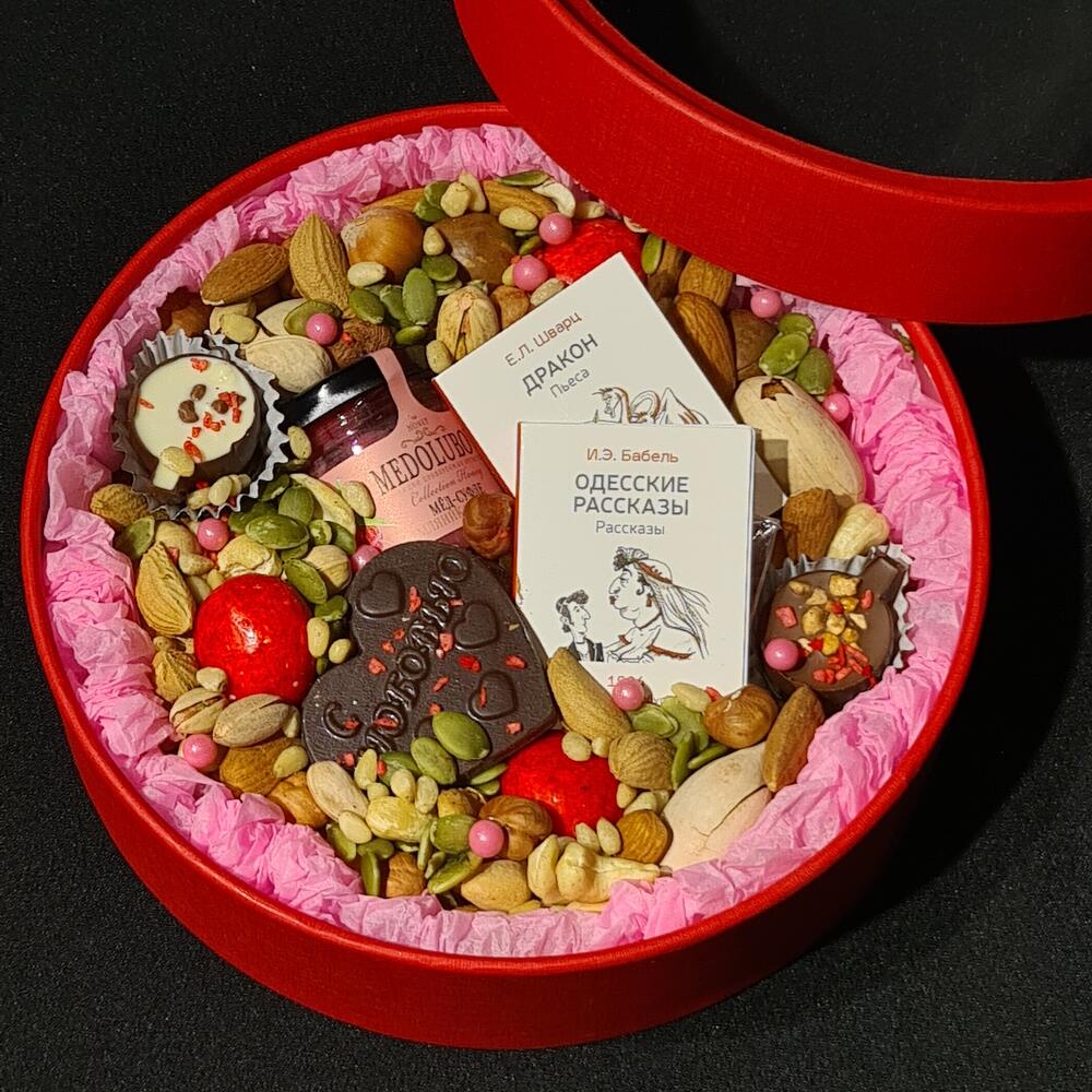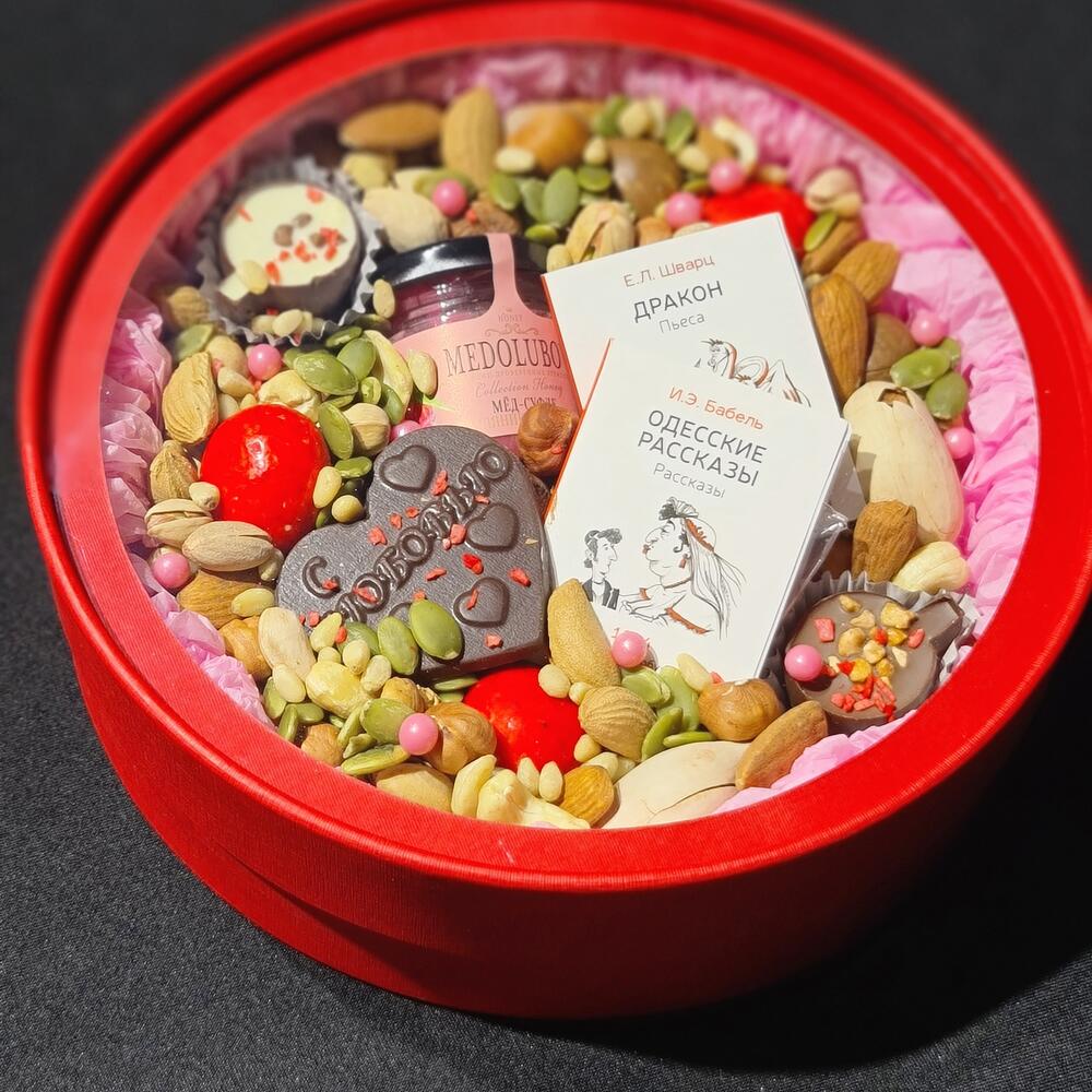 Кешью - 35 гр. Миндаль - 43 гр. Мед суфле - 1 шт. Фундук - 40 гр. шоколадка ручной работы - 13 гр. фундук в скорлупе - 40 гр. макадамия в скорлупе - 35 гр. грецкий орех в скорлупе - 36 гр. миндаль в скорлупе - 84 гр. пекан в скорлупе - 35 гр. драже шоколадное - 37 гр. фисташка орех в скорлупе - 47 гр. рисовые шарики - 3 гр. тыквенные семечки очищенные - 15 гр. кедровые орехи - 6 гр. стильные штучки ( конфеты ) - 2 шт. чай со смыслом - 2 шт.
