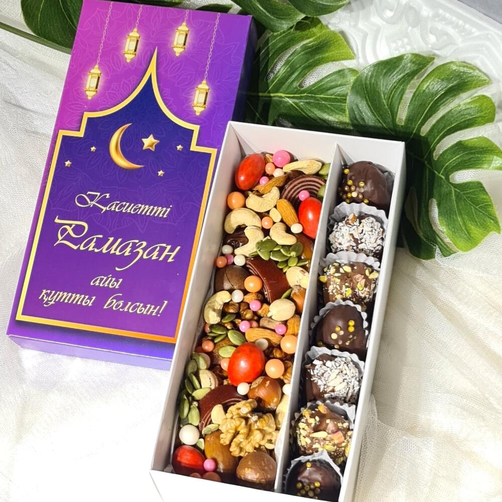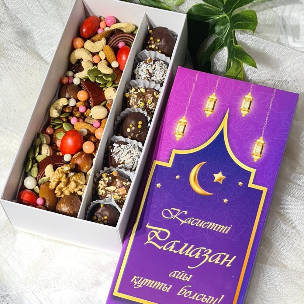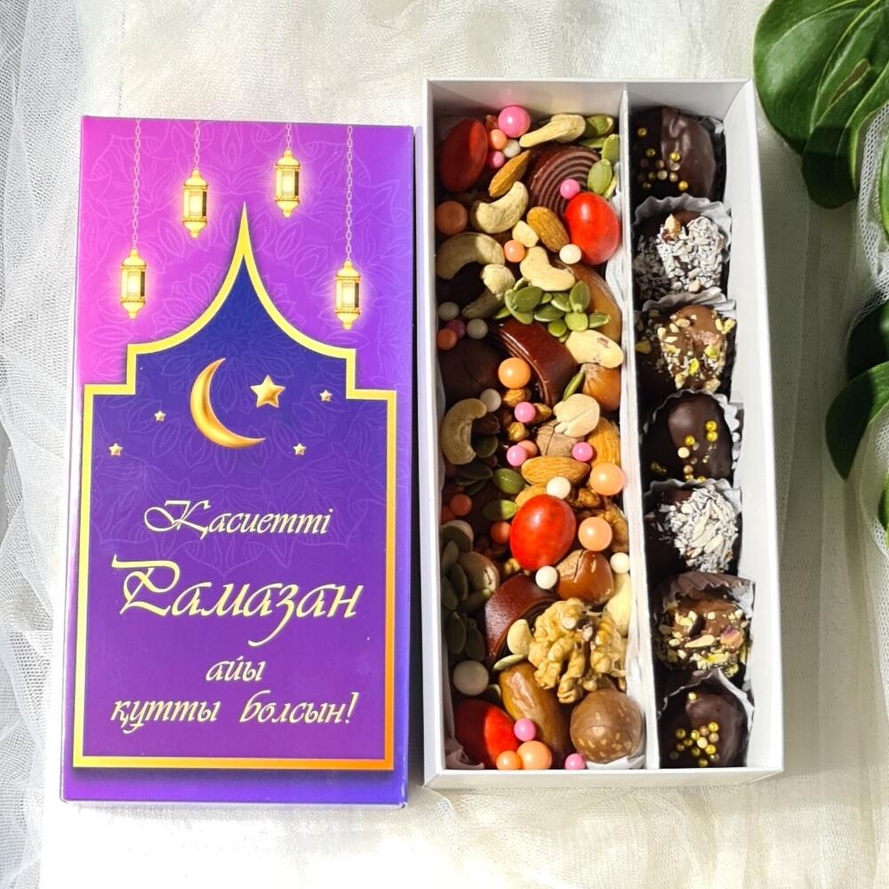 Подарочный набор в светлый месяц Рамазан- отличный вариант комплимента гостям, коллегам по работе ,родным и друзьям! Королевские финики в бельгийском шоколаде , орехи и пастила- всё самое вкусное для вас и ваших близких! Отличный вариант корпоративных подарков !