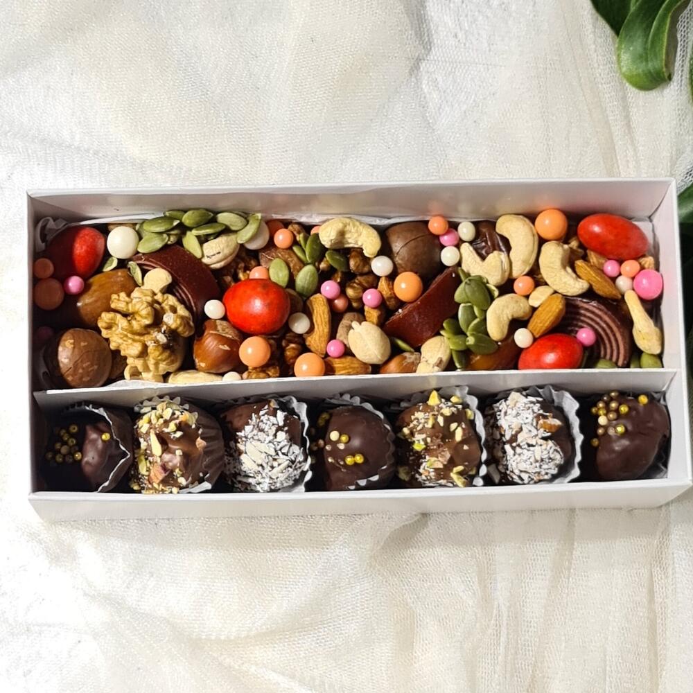 Коробка подарочная - 1 шт. Кешью - 20 гр. Открыточка с вашими пожеланиями - 1 шт. Финики - 34 гр. воздушный рис - 14 гр. фундук в скорлупе - 22 гр. миндаль в шоколаде - 26 гр. макадамия в скорлупе - 25 гр. грецкий орех в скорлупе - 41 гр. пастила фруктовая - 64 гр. пекан в скорлупе - 22 гр. грецкий орех чищенный - 24 гр. миндаль чищенный - 18 гр. тыквенные семечки очищенные - 10 гр. бадам - 31 гр. королевские финики в бельгийском шоколаде - 7 шт.
